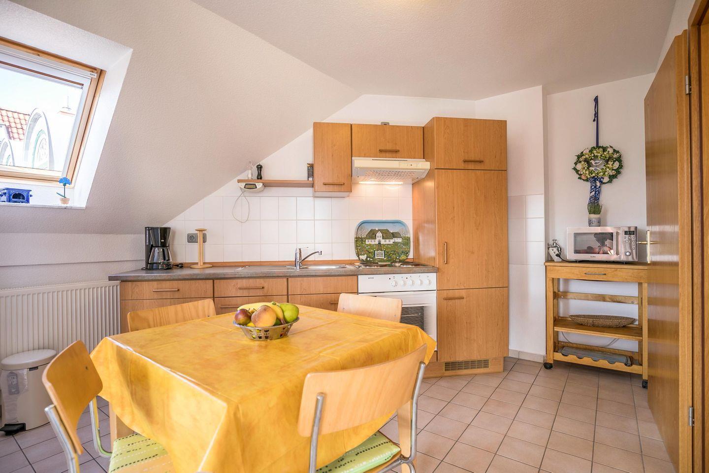 offene Küche mit Essplatz, Küchenzeile mit Herd und Backofen, Mikrowelle, Kühlschrank ohne Gefrierfach, Geschirrspüler, Wasserkocher, Toaster