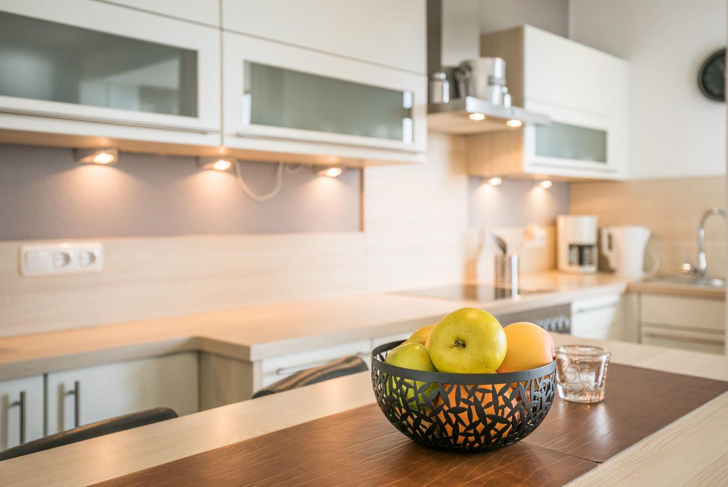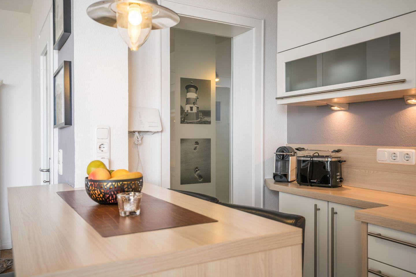 Einbauküchenzeile, Esstresen mit 4 Stühlen, Geschirrspüler, Backofen, Cerankochplatte, Abluft, Kühlschrank mit Gefrierfach, Kaffeemaschine, Nespresso, Wasserkocher, Eierkocher, Toaster, Nespresso-Kapselmaschine