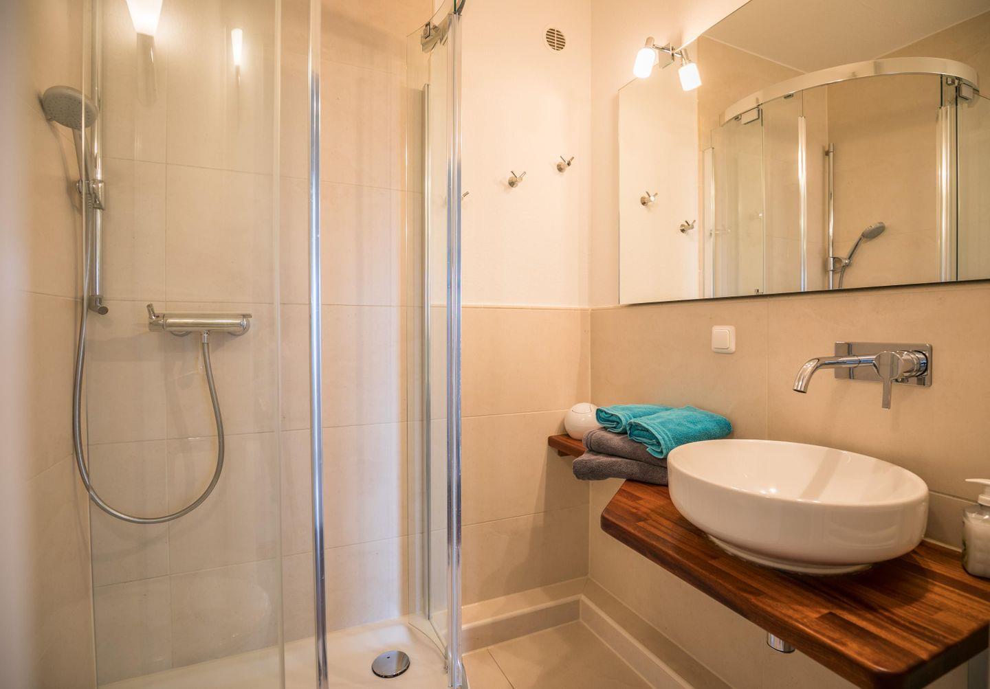 Dusche, WC, Waschbecken, Spiegel, Handtuchtrockner, Föhn, Abluft