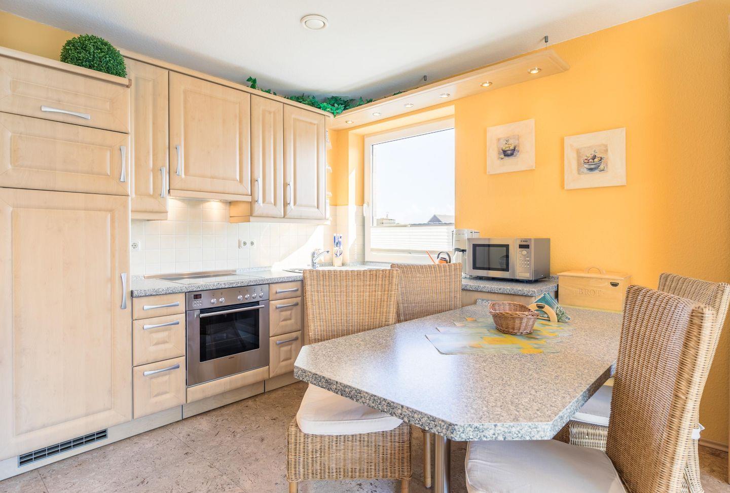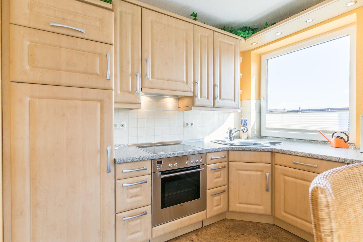 offene Einbauküche, Geschirrspüler, Backofen, Abluft, Kühlschrank mit Gefrierfach, Kaffeemaschine, Mikrowelle, Toaster