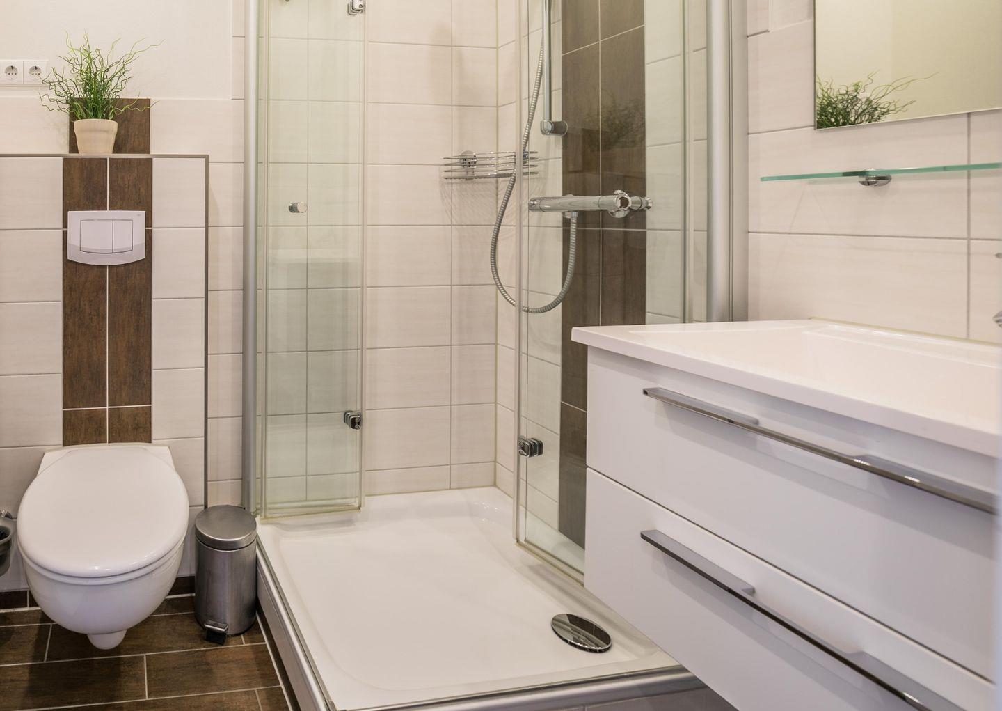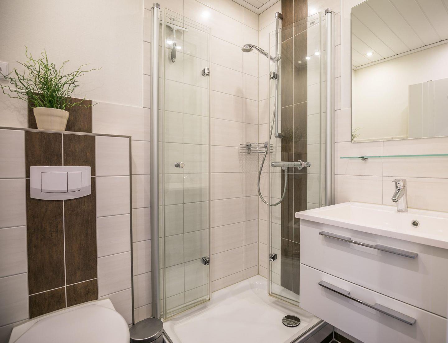 Dusche, WC, Waschbecken mit Unterschrank, Spiegel, Föhn, Handtuchtrockner