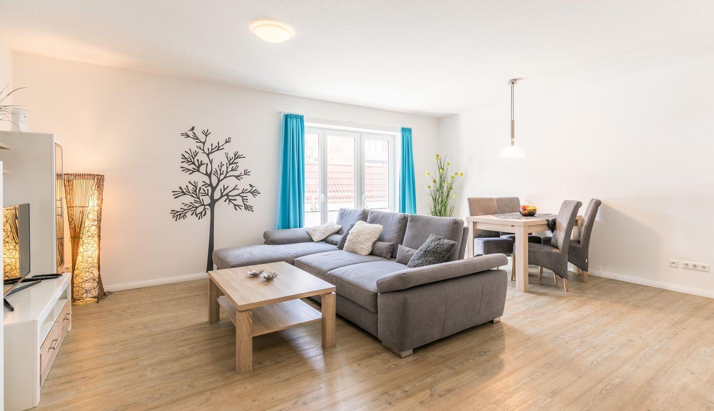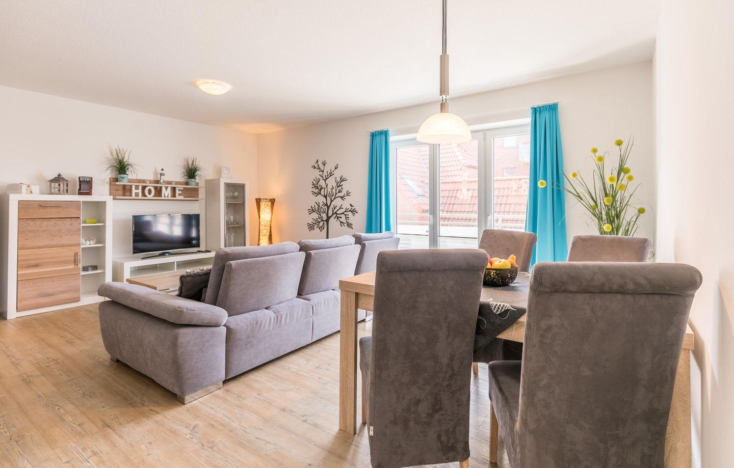 TV, Schränke, gemütliches großes Sofa, Esstisch mit 4 Stühlen, Zugang zum Balkon, Radio, Garderobe