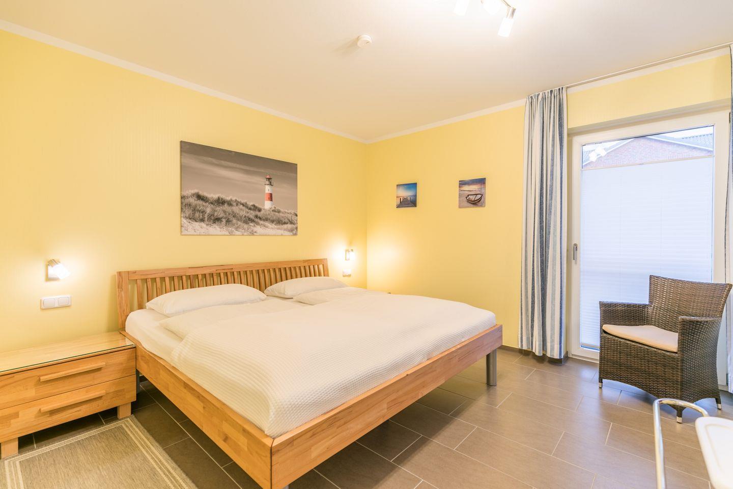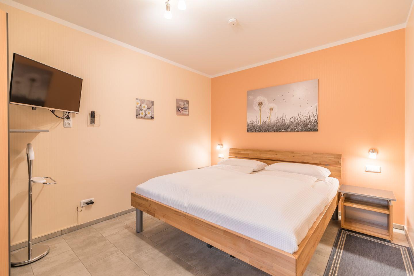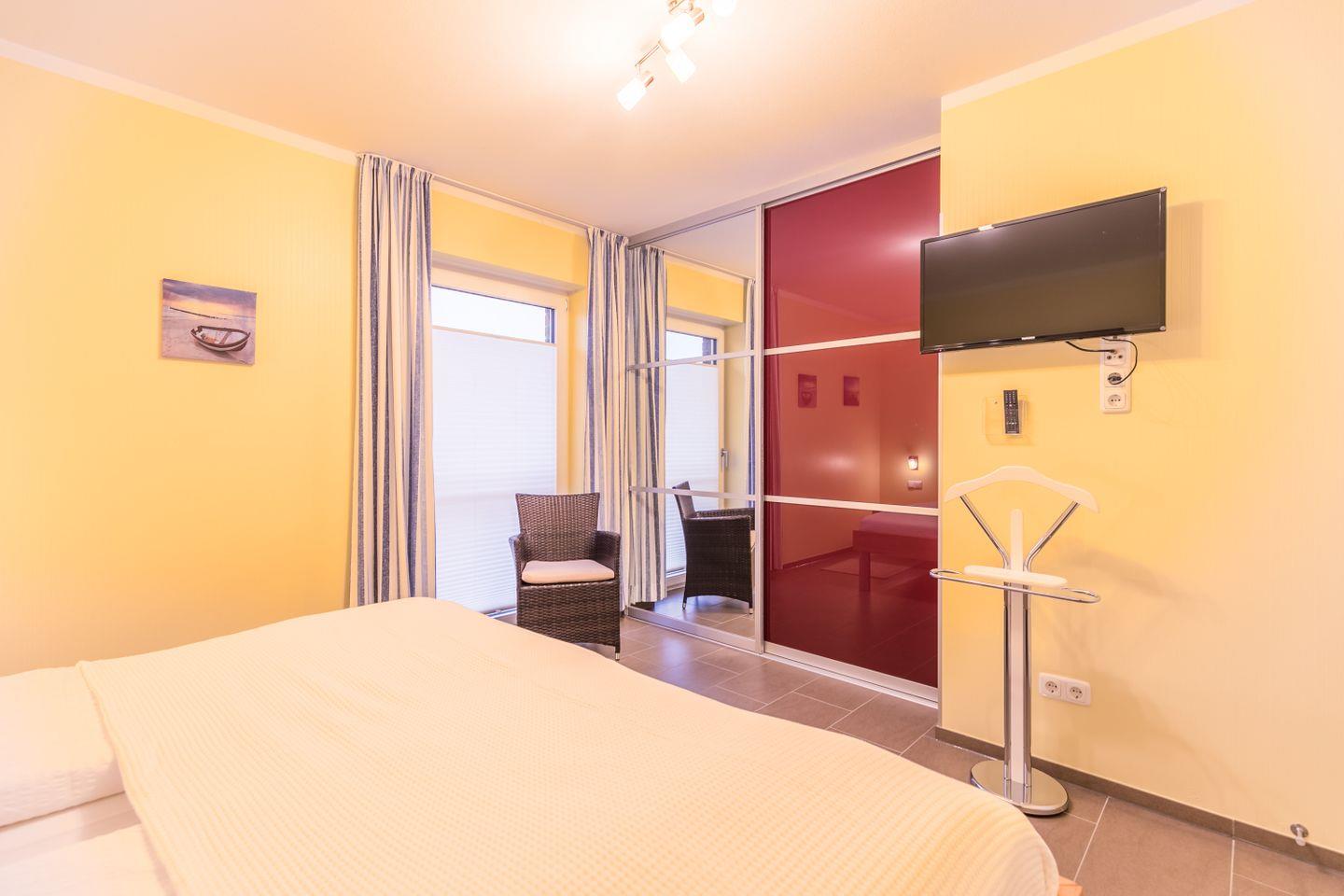 Doppelbett (1,80x2,00m) verstellbare Lattenroste Komforthöhe, Kleiderschrank, Nachttische, Sessel, Herrendiener, Außenrolladen, TV, Zugang zum Balkon
