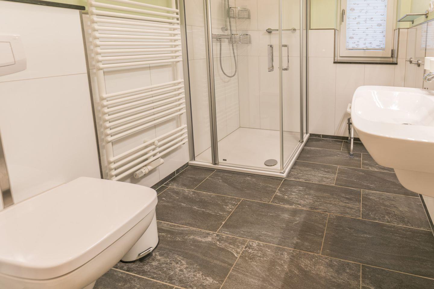 Ebenerdige Dusche, WC, Waschbecken, Spiegel, Fön, Fenster, Duschhocker, Handtuchwärmer