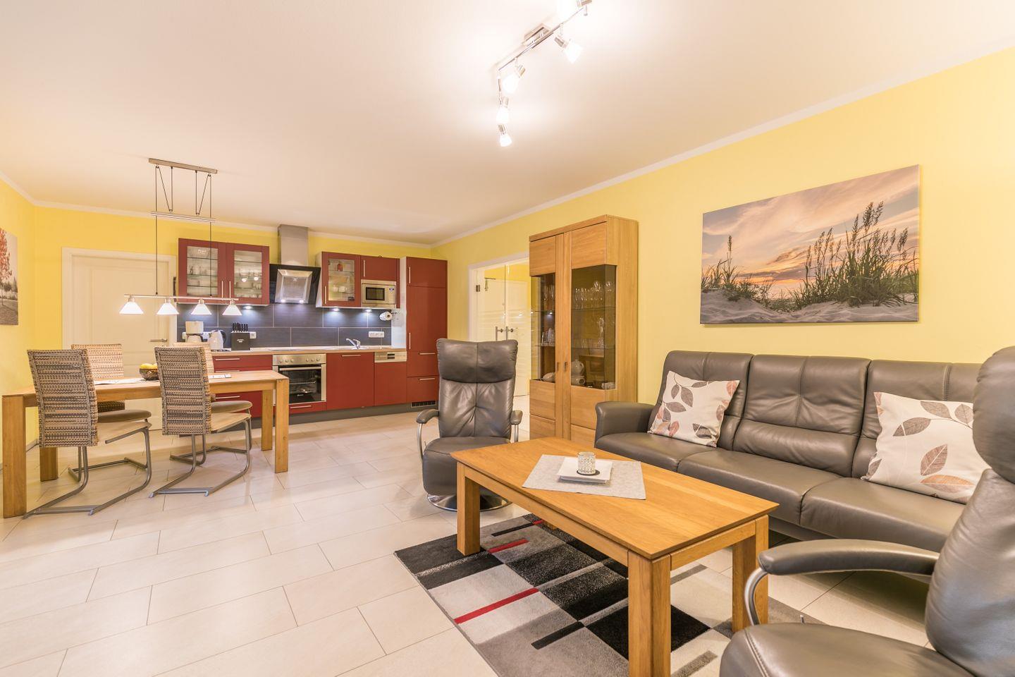 Auf großzügigen 83 m² im ersten Obergeschoss erwartet Sie eine helle und komfortabel ausgestattete Wohnung für bis zu vier Personen. Der Wohnbereich lädt mit einer bequemen Ledercouch, einem Relax-Sessel und einem 50-Zoll-TV zum Entspannen ein, während der Balkon frische Nordseeluft und erholsame Momente im Freien bietet. Die voll ausgestattete Küche lässt keine Wünsche offen.