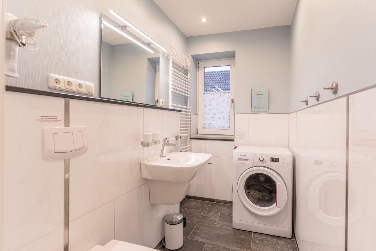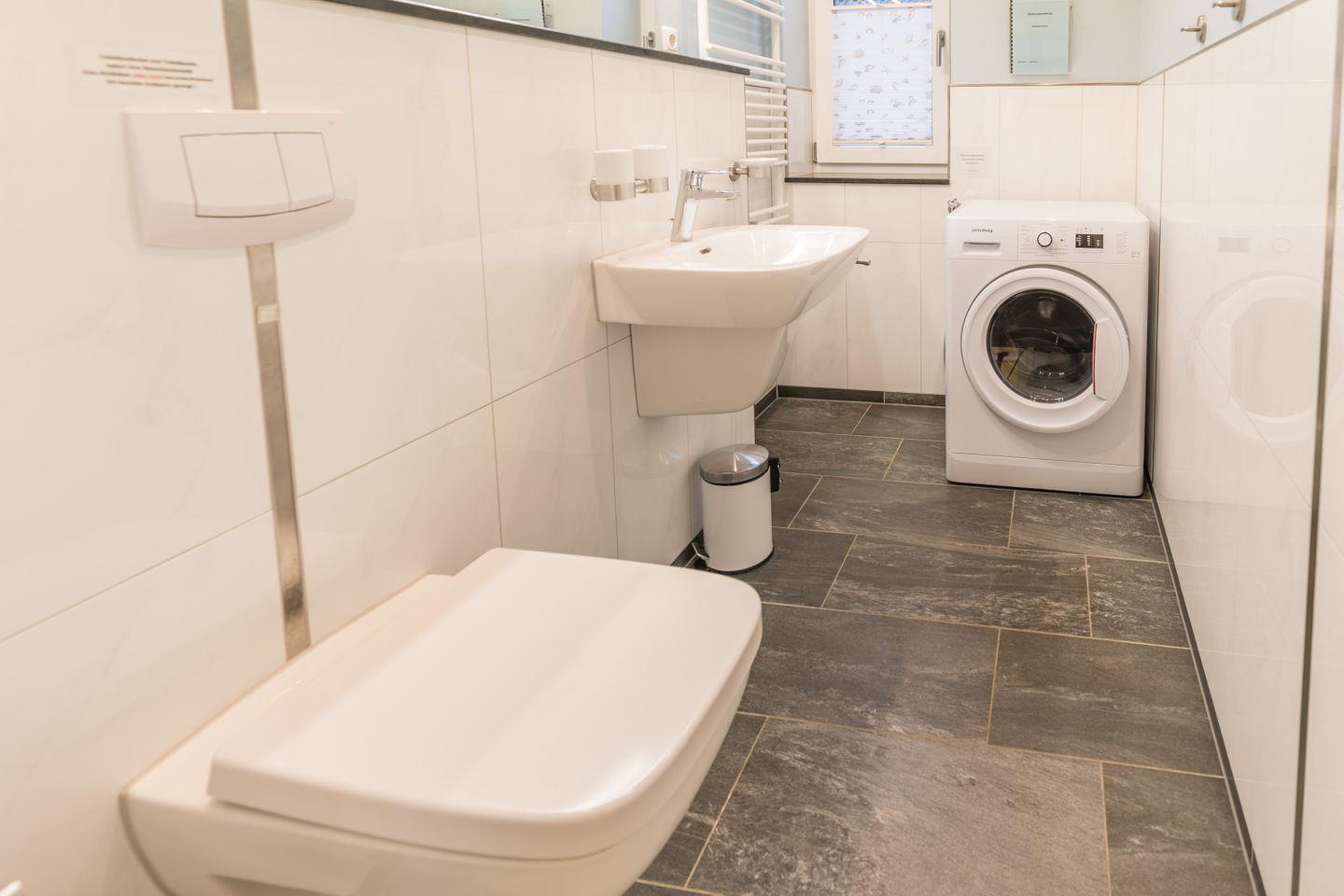WC, Waschbecken, Spiegel, Fön, Fenster, Duschhocker, Handtuchwärmer, Waschmaschine mit Trockner