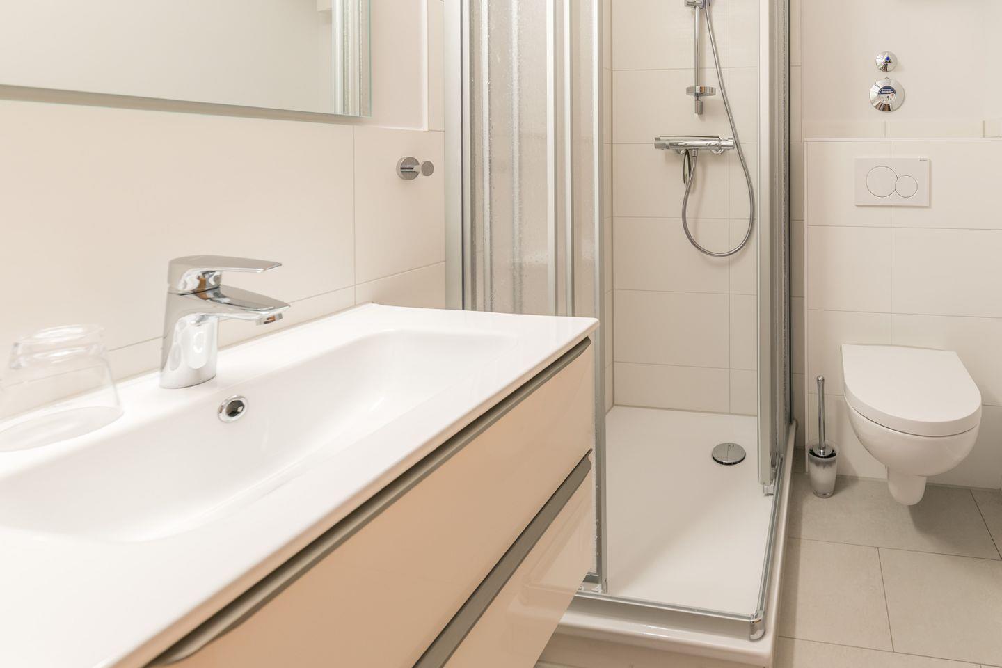 Dusche, WC, Waschbecken, Spiegel, Föhn, Handtuchtrockner, Abluft