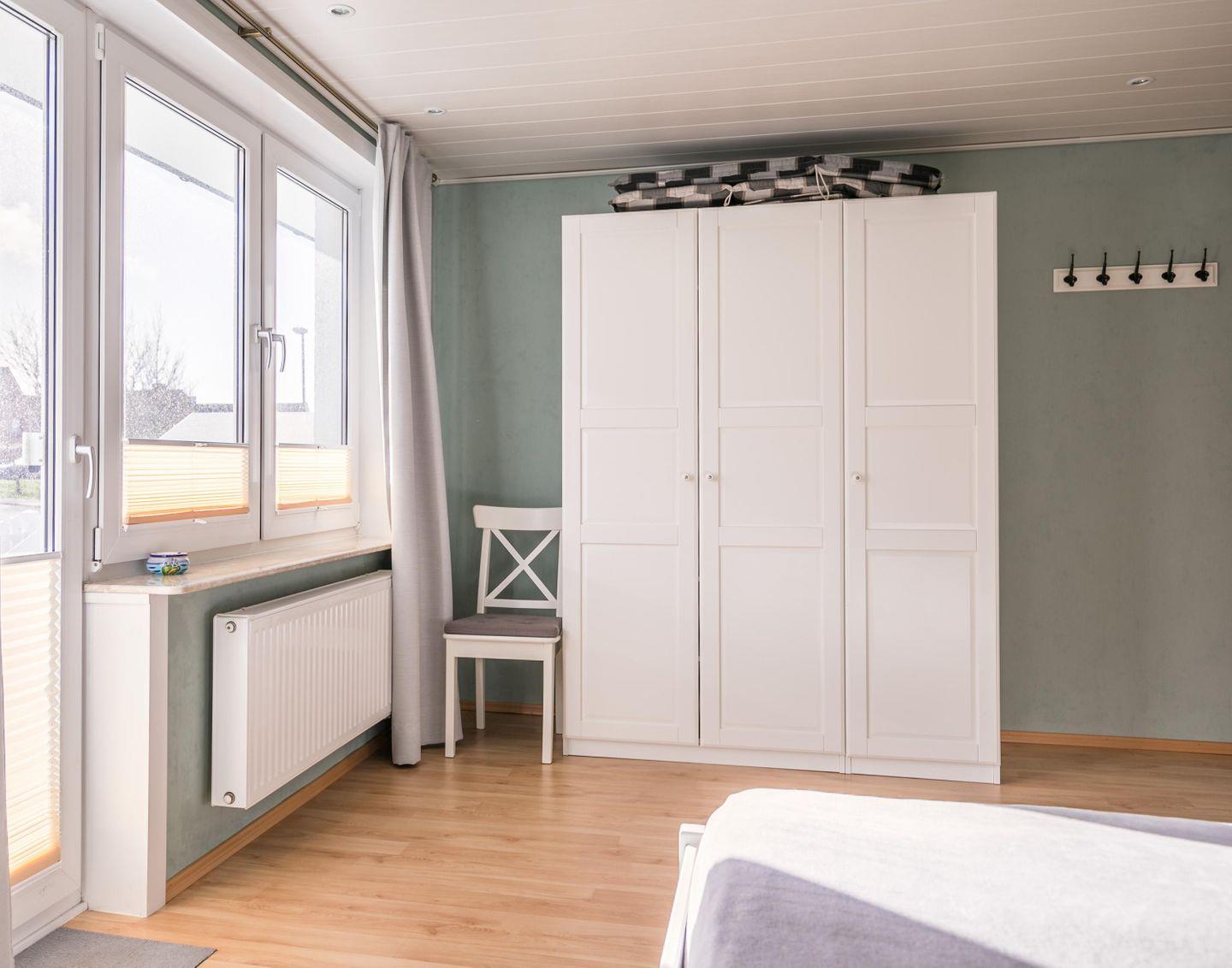 Doppelbett mit getrennten Matratzen (je 2,00 x 0,90m), verstellbarer Lattenrost (Kopf- und Fußteil), Nachttischschränke + Lampen, 3-türiger Kleiderschrank, Zugang zum Balkon, Radiowecker, Flachbild-TV, Verdunklungsvorhang und Plissee