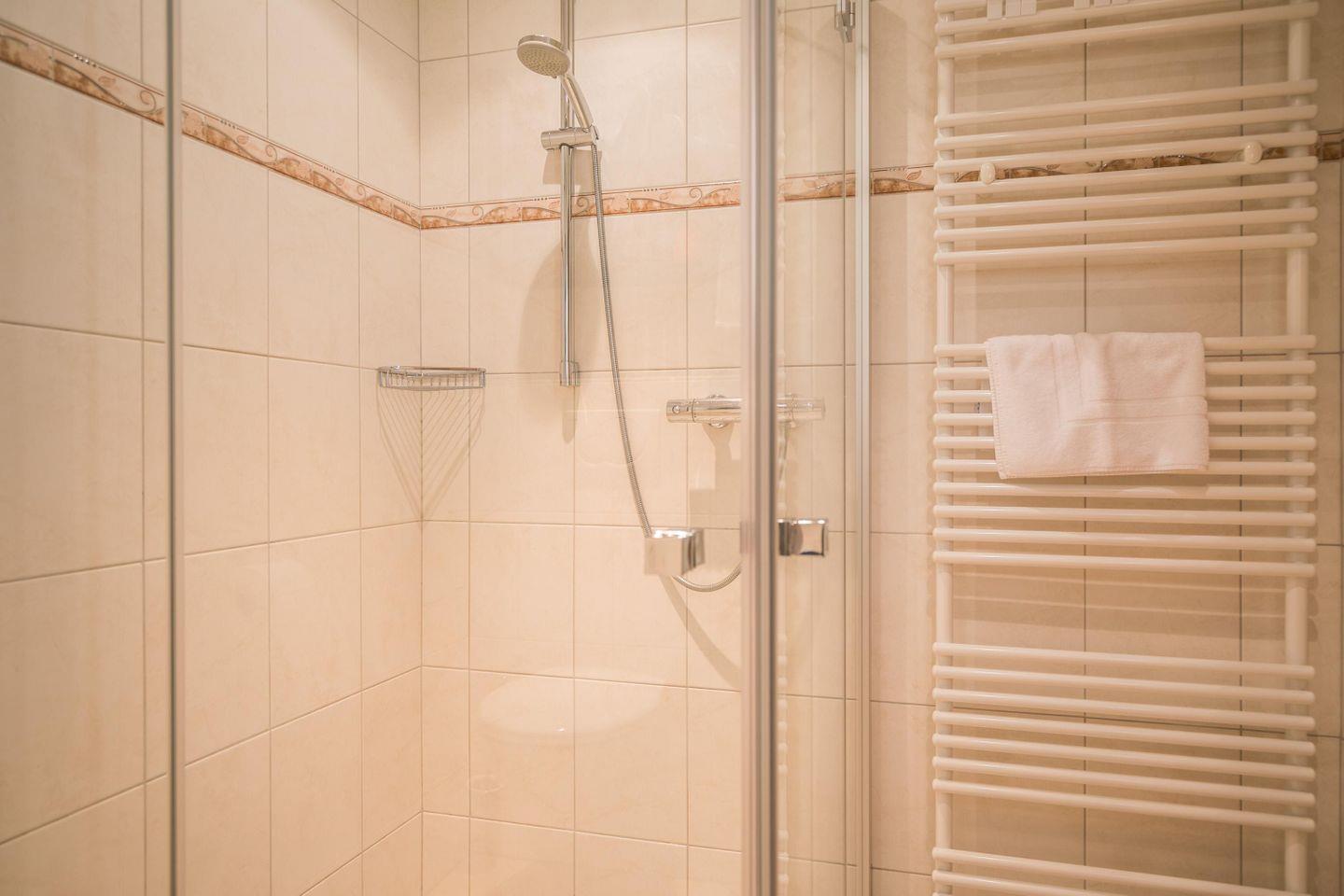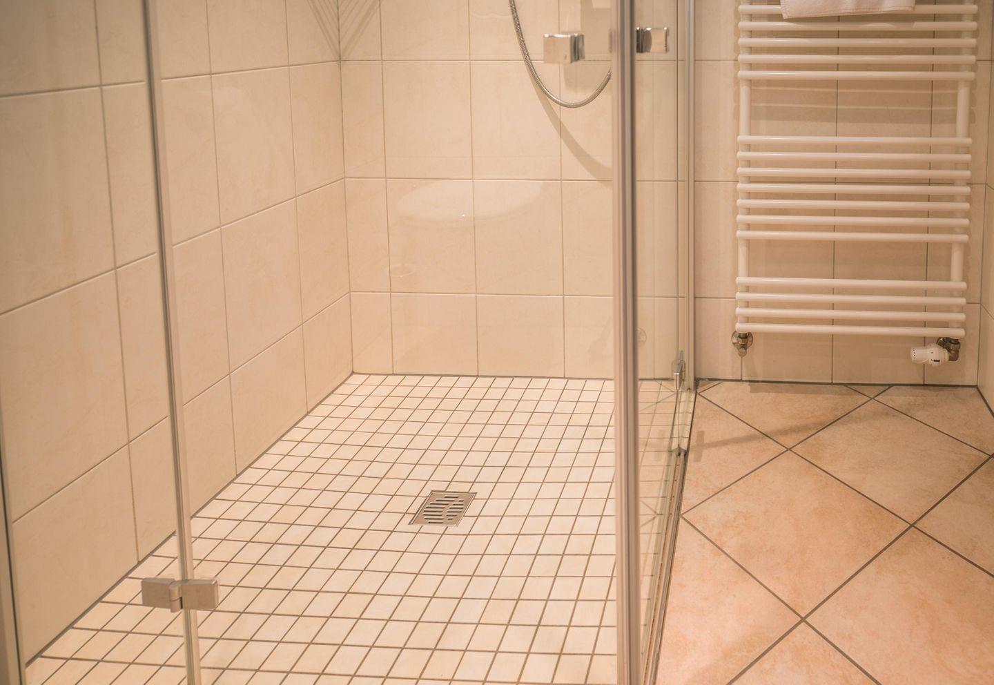 bodengleiche Dusche, WC, Spiegel, Waschbecken, Handtuchtrockner, Abluft, Föhn