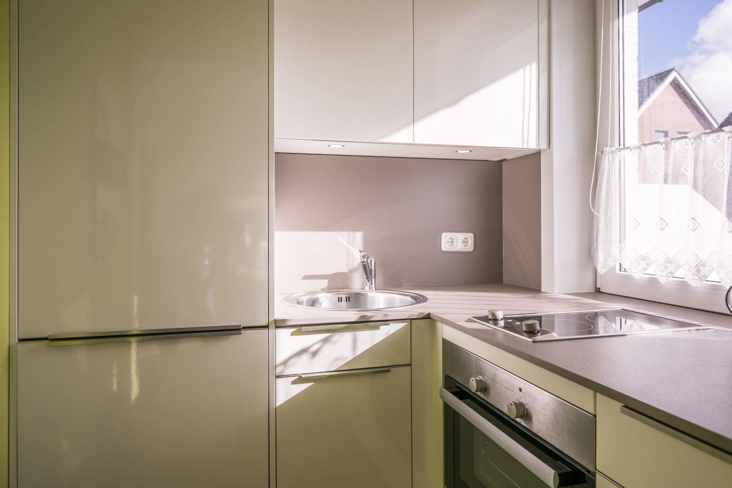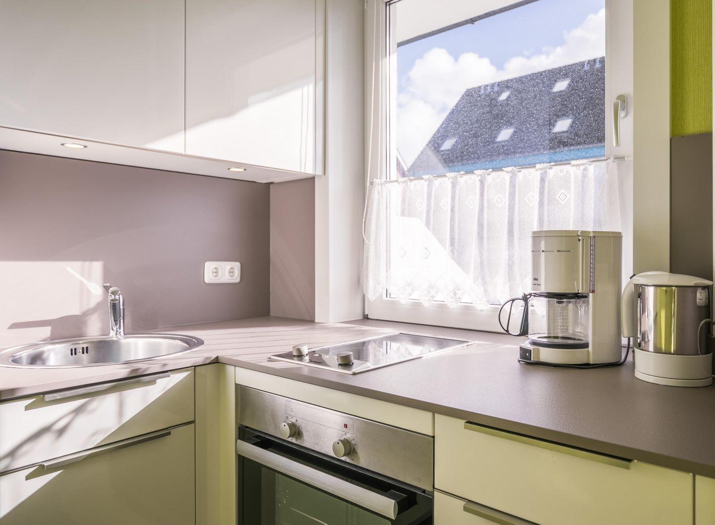 2-Platten-Ceranfeld, Kühlschrank mit Gefrierfach, Geschirrspüler, Backofen, Kaffeemaschine, Wasserkocher, Toaster
