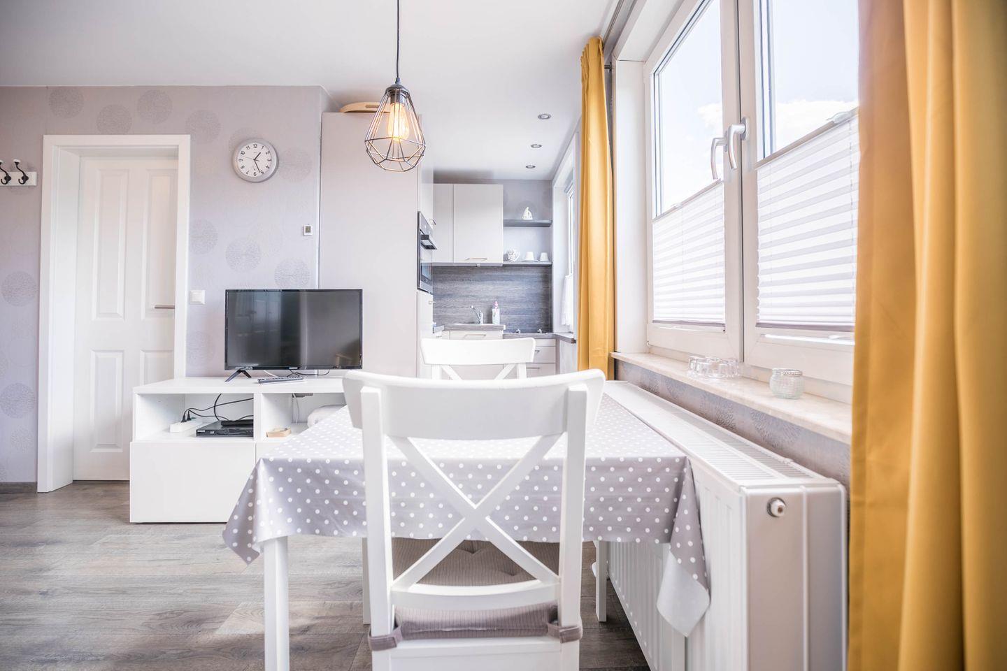 Flachbild-TV, DVD&Blu-ray-Player, Sofa, Tische + Stühle, Zugang zum Balkon, Garderobe