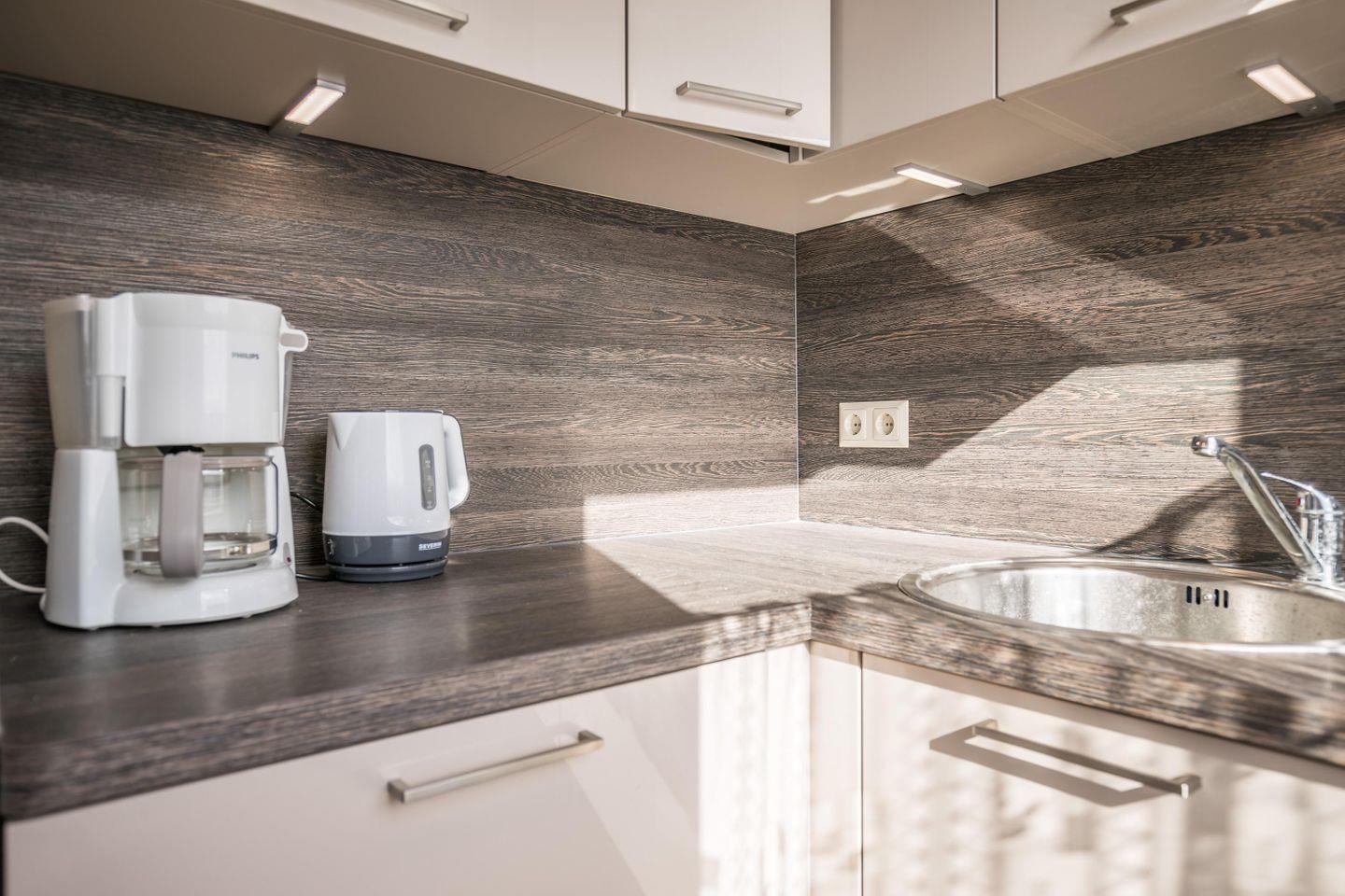 Ceranfeld, Geschirrspüler, Backofen, Kühlschrank mit Gefrierfach, Wasserkocher, Kaffeemaschine, Toaster