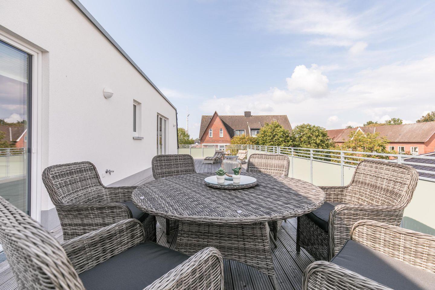 Die exklusive Penthouse Wohnung MeerGenuss - belegbar mit 5 Personen - befindet sich in einem behindertengerechten Mehrfamilienhaus in zentraler Lage von Büsum. Eine riesige Dachterrasse (83m²) ist das Highlight dieser hochwertig und modern eingerichteten Ferienwohnung! Eine weitere südlich ausgerichtete Dachterrasse (20m²) macht den Rundum-Blick über Büsum perfekt.