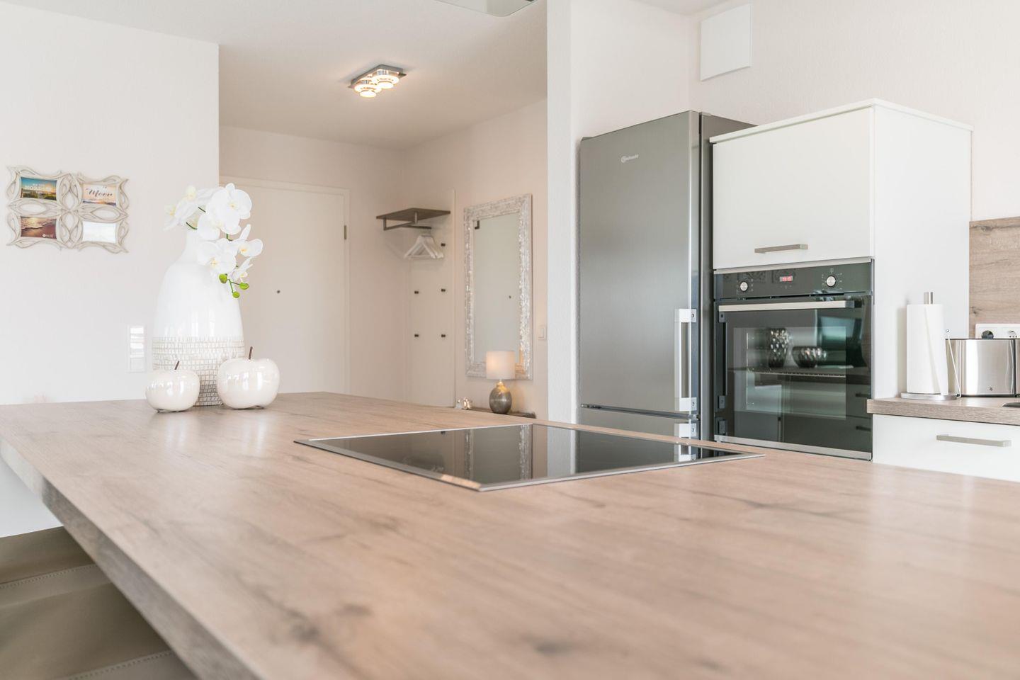 Kühlschrank mit Gefrierschrank (3 Schubladen), Backofen, Ceranfeld, Dunstabzug, Mikrowelle, Geschirrspüler, Kaffeemaschine, Kapselkaffeemaschine, Toaster, Wasserkocher, Tresen + Barhocker, Zugang zur großen Dachterrasse