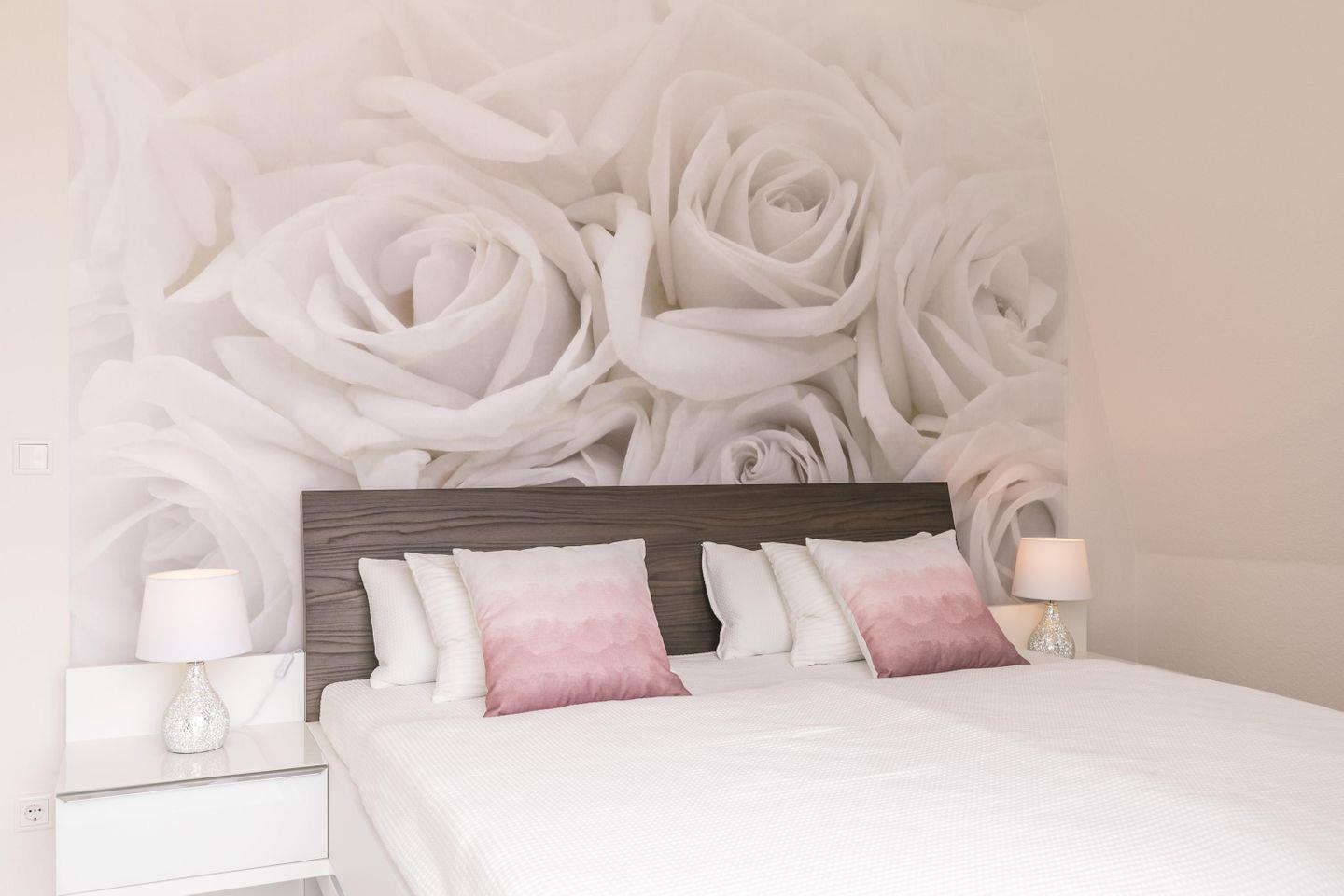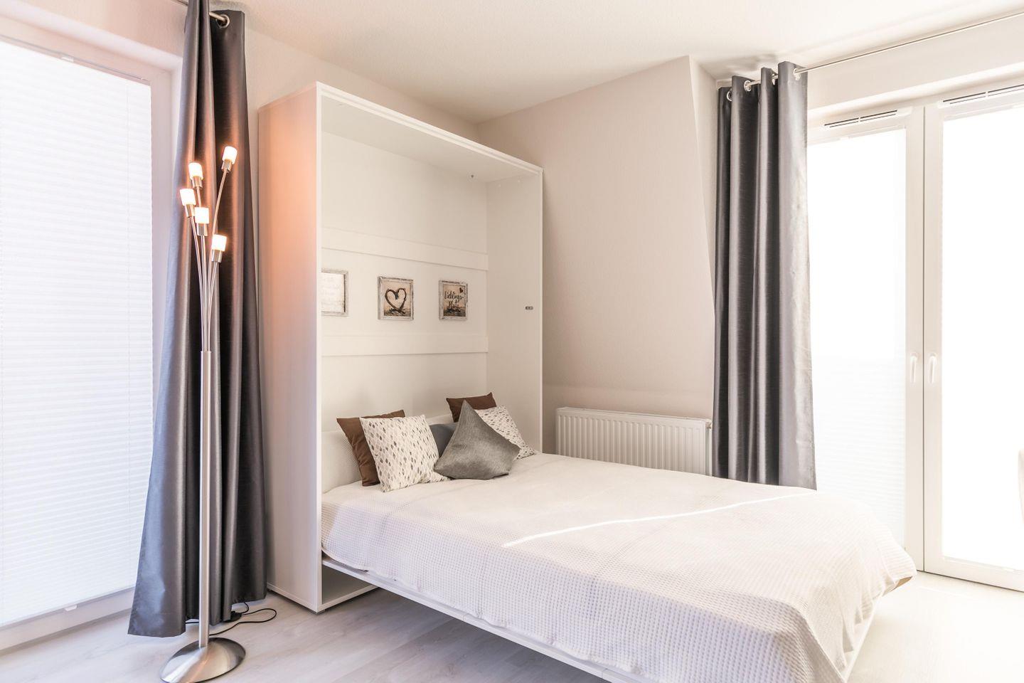 In den beiden Schlafzimmern tragen ruhige, helle Farben und gemütliche Betten zu einem ruhigen Schlaf bei. Im Wohnraum befindet sich ein modernes Schrankbett.