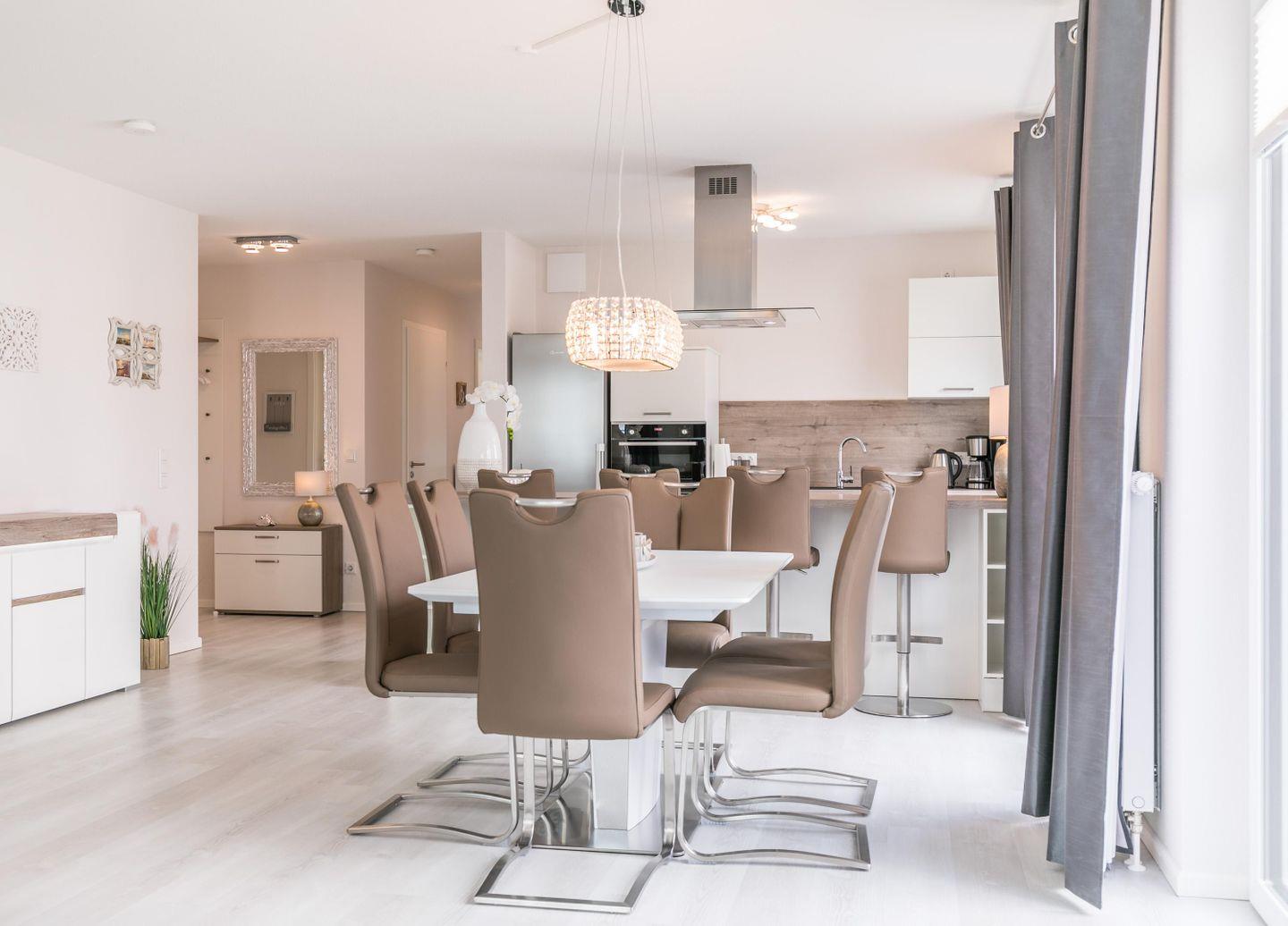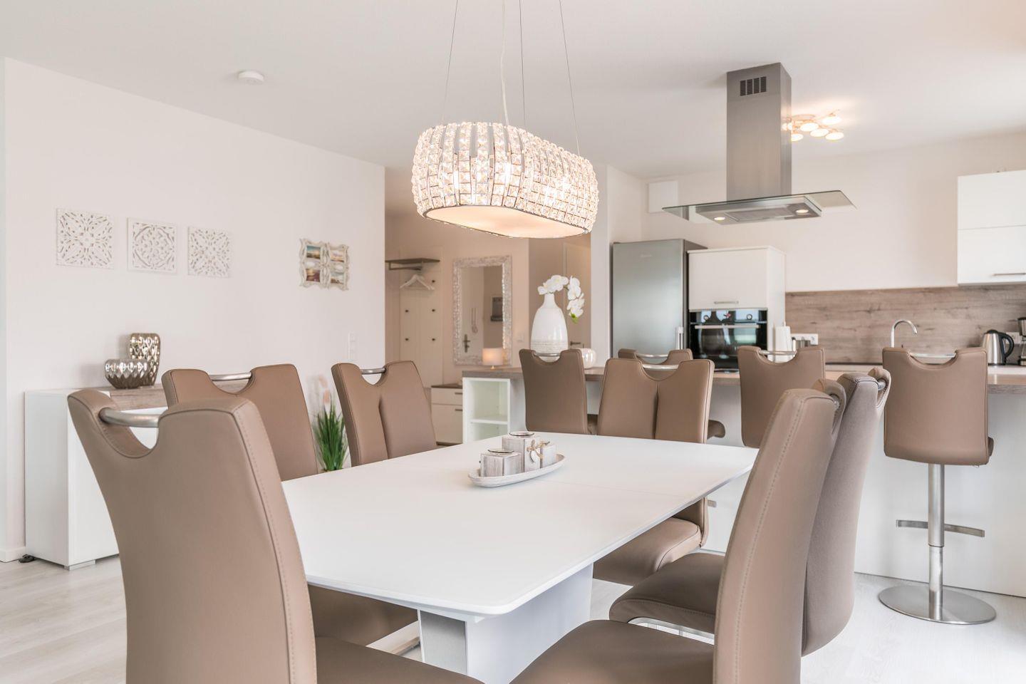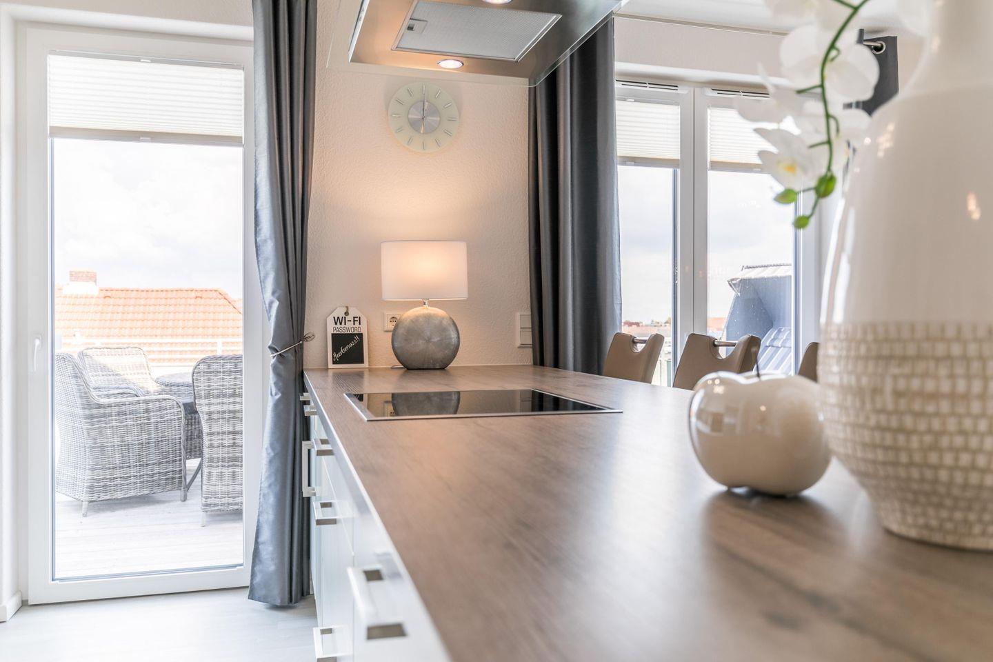 Der zur Küche offene Wohnraum bietet viel Platz und lädt zum gemeinsamen Verweilen ein. Für ausreichend Entertainment sorgt der große Flachbild-TV mit Blu-Ray-Player. Aber auch gemütliche Kochabende sind in der voll ausgestatteten Küche mit Tresen und Barhockern - eine willkommene Abwechslung. Durch die verschiedenen Dachterrassen können Sie praktisch zu jeder Tageszeit ein paar Sonnenstrahlen genießen!