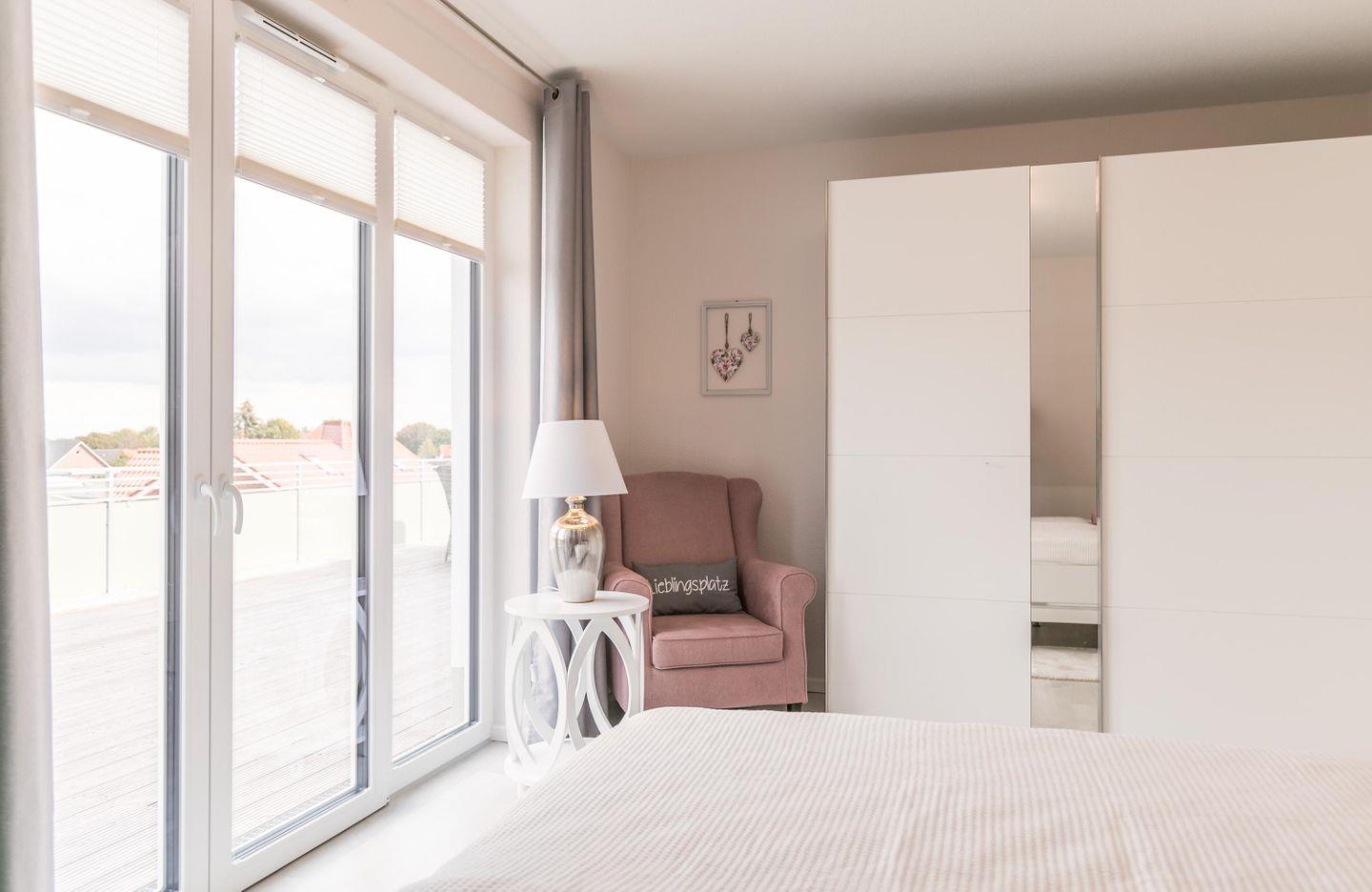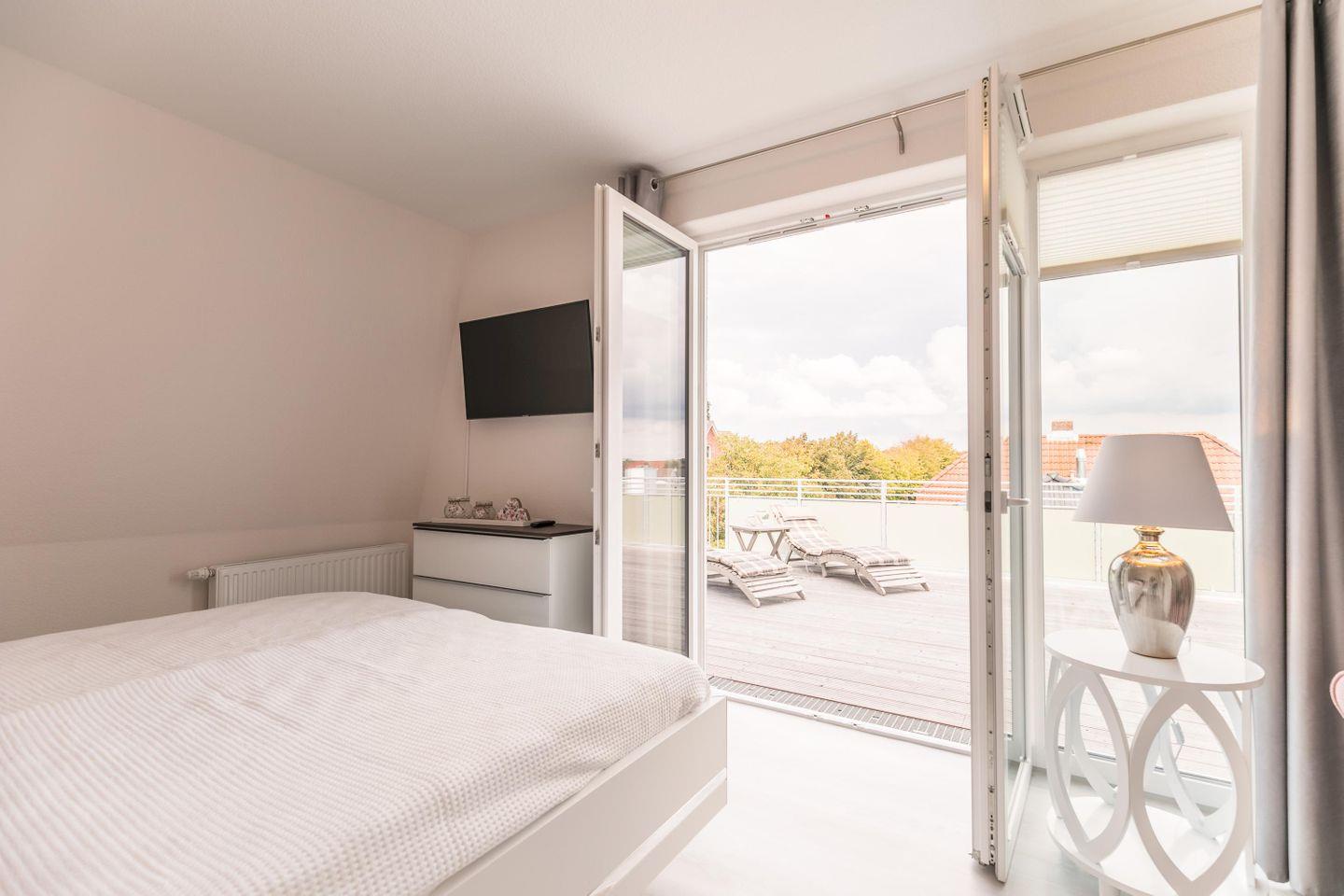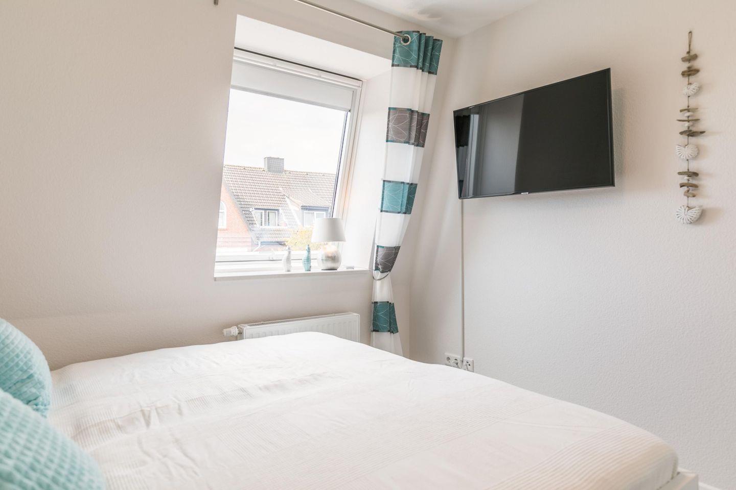 Doppelbett (200 cm x 180 cm ) mit getrennten Matratzen, Lattenroste höhenverstellbar( Kopf- und Fußteil), Nachttische + Lampen, Kleiderschrank, Kommode, Sessel, 43“ Flachbild-Smart-TV, Plissee und Verdunklungsvorhang, Zugang zur großen Dachterrasse