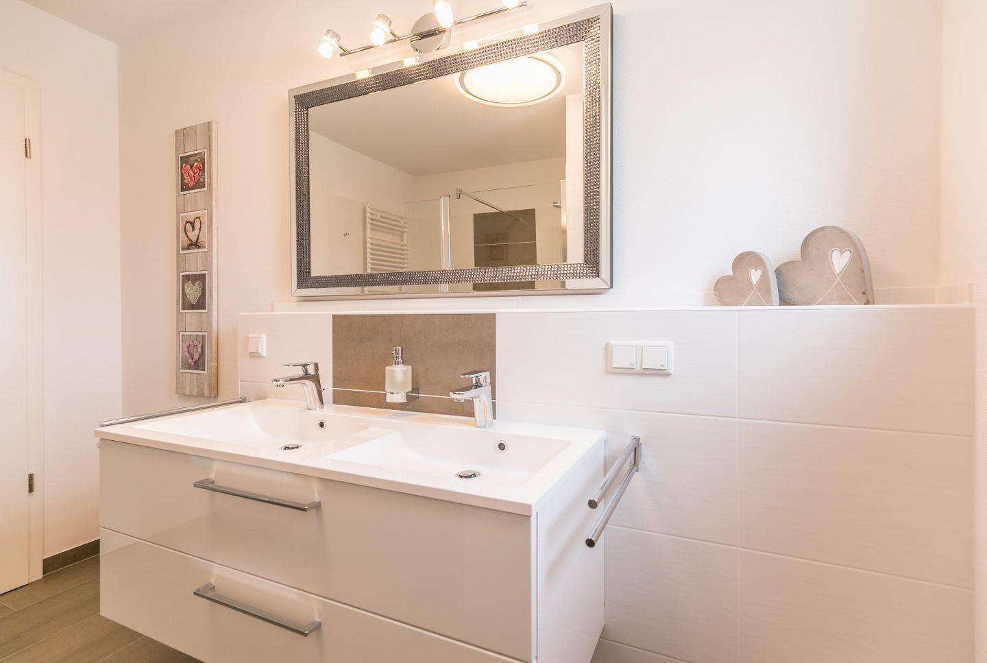 Bodentiefe Dusche, Doppelwaschbecken mit Unterschrank, Spiegel, Fenster mit Plissee, Abluft, WC, Fußbodenheizung, Handtuchtrockner