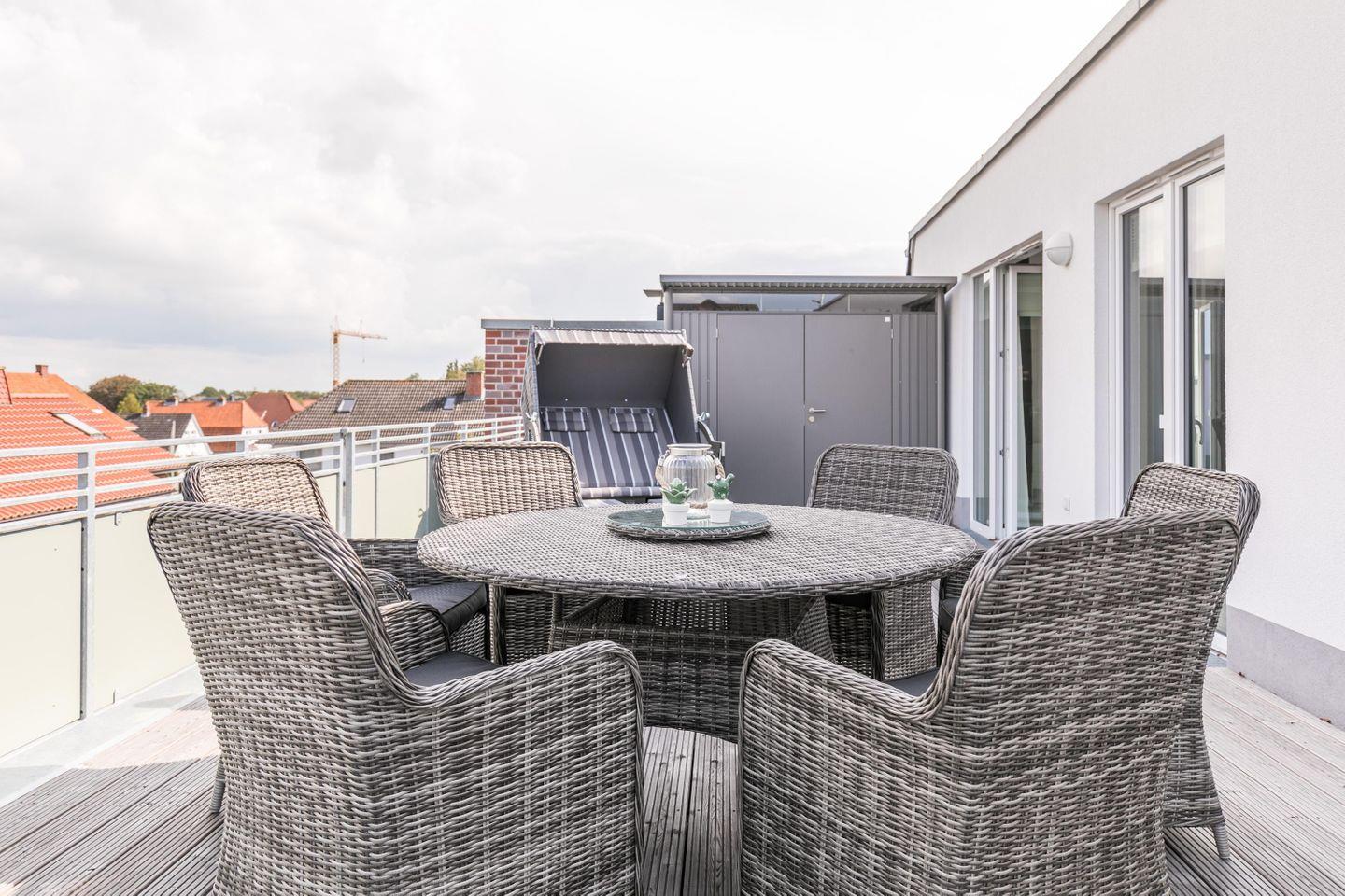 Die exklusive Neubau-Penthouse Wohnung MeerGenuss befindet sich in einem behindertenfreundlichen Neubau in zentraler Lage von Büsum. Eine riesige Dachterrasse (83m²) ist das Highlight dieser hochwertig und modern eingerichteten Ferienwohnung für 5 Personen!