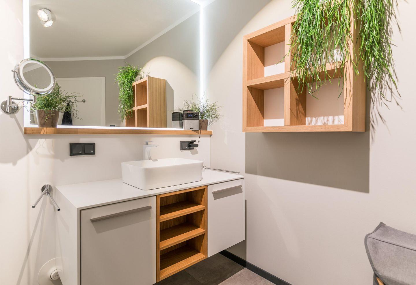 Bodentiefe Dusche, Duschhocker, WC, großer Spiegel, Kosmetikspiegel, Hängeschrank, Handtuchtrockner, Fön, Abluft, Regal, Radio