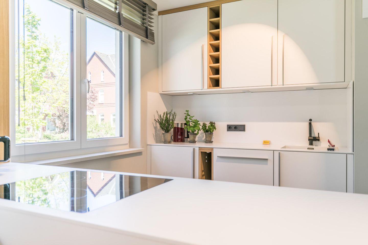 Sie werden im warmbeleuchteten Eingangsbereich empfangen. Durch eine Glasfront kommen Sie in die offene Wohnküche. Ein außerordentliches Ambiente erwartet Sie: