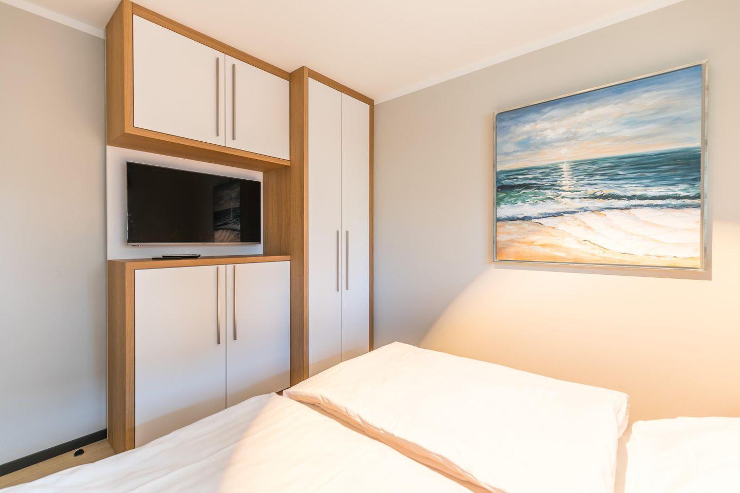 Doppelbett mit getrennten Matratzen (je 2,00m x 0,90m), Nachttische + Lampen, großer Kleiderschrank, Flachbild-TV, Verdunkelungsmöglichkeit + Plissee, Fliegengitter