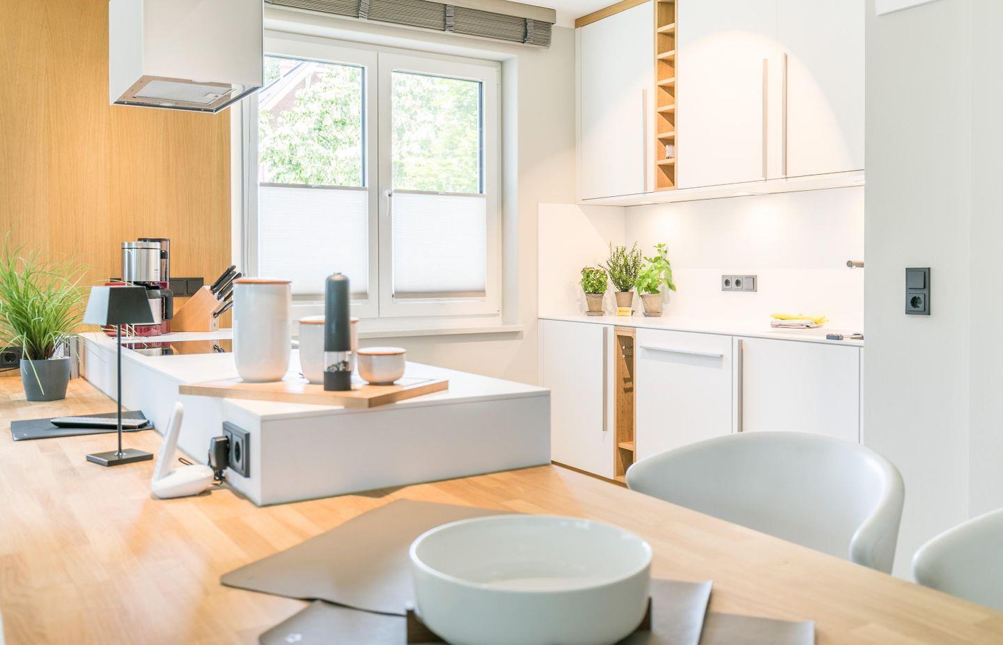 Induktionskochfeld, Abluft, Backofen, Geschirrspüler, Kühlschrank mit Gefrierfach, Toaster, Wasserkocher, Kaffeemaschine, Eierkocher