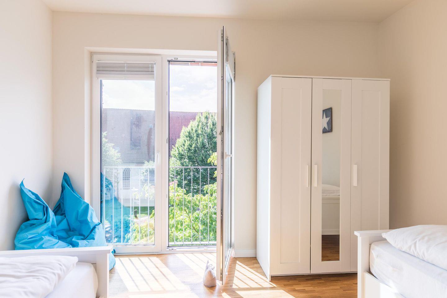 2 Einzelbetten, Nachttisch, Bettlampen, Kleiderschrank mit Spiegel, Sitzsack, Verdunkelungsplissee