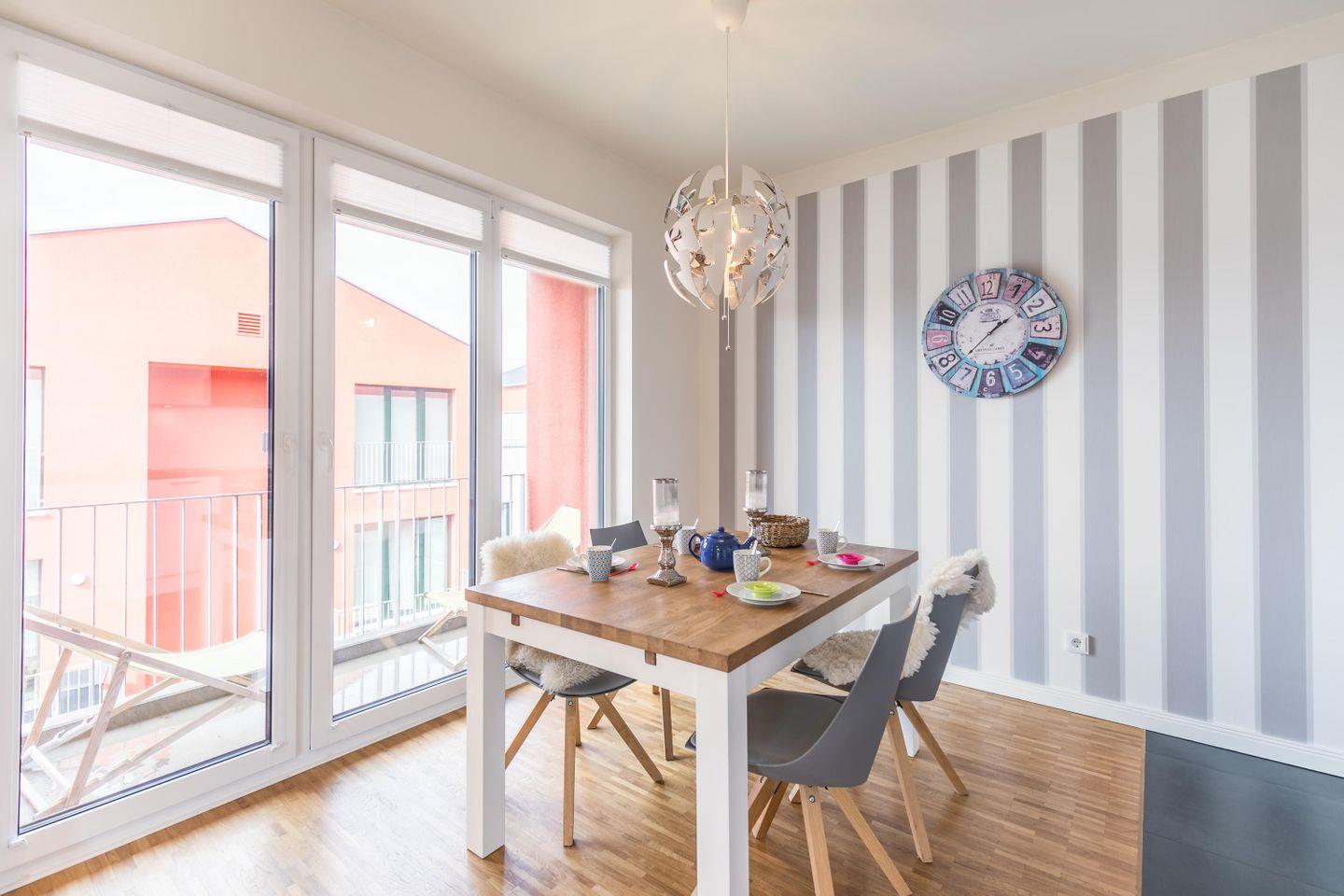 Backofen, Ceranfeld, Geschirrspüler, Kühlschrank mit Gefrierfach, Kaffeemaschine, Wasserkocher, Toaster, Dunstabzugshaube, Esstisch mit 4 Stühlen, Zugang zum kleinen Balkon mit 2 Sitzmöglichkeiten