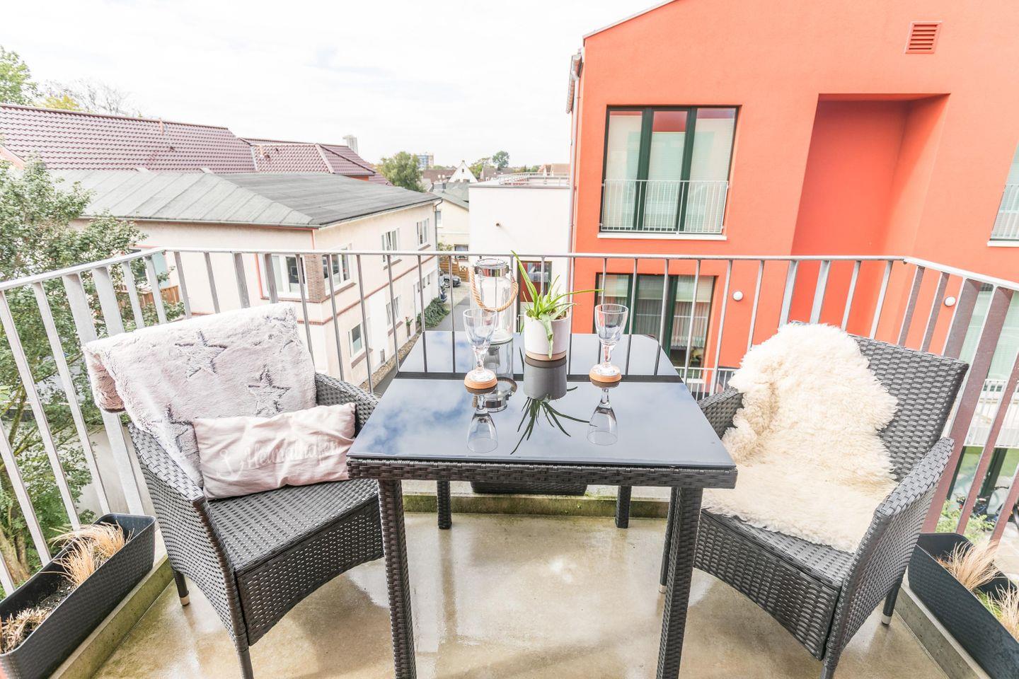 In der modern eingerichteten Wohnküche erwarten Sie zwei Balkonzugänge, eine gemütliche Couchecke sowie ein geräumiger Küchen- und Essbereich.