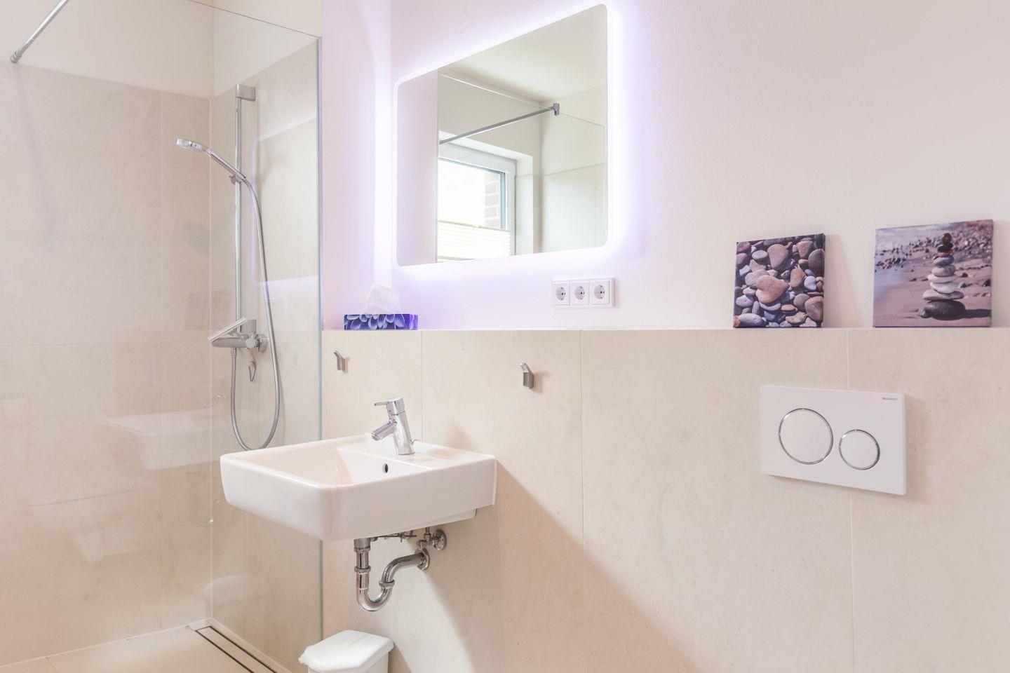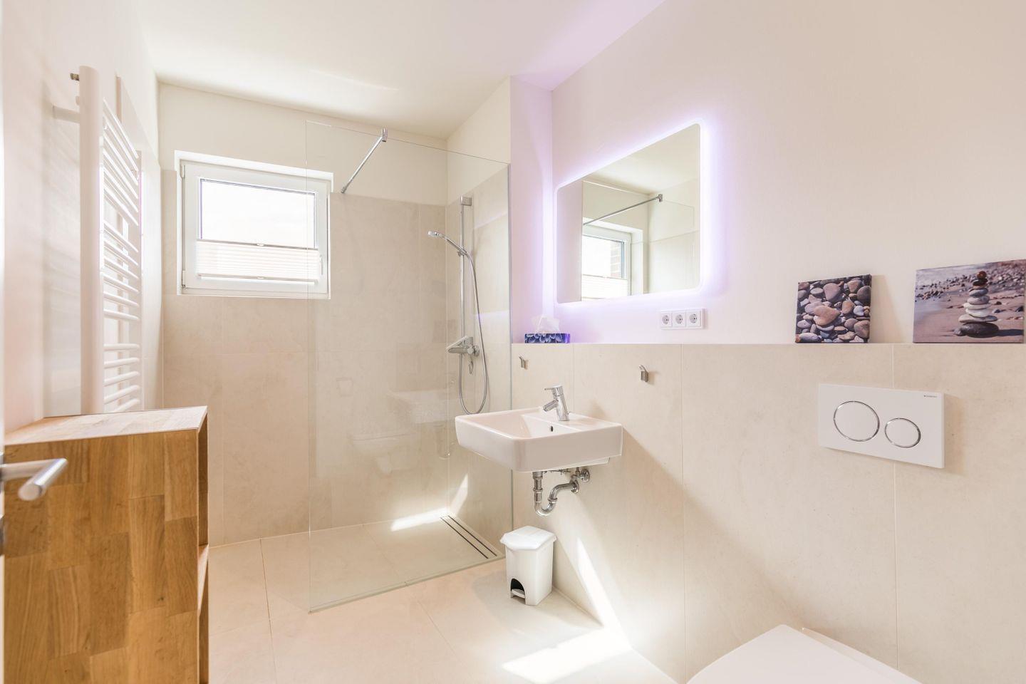 Bodentiefe Dusche, WC, Waschbecken, Spiegel, Handtuchtrockner, Fön, Regal, Fenster