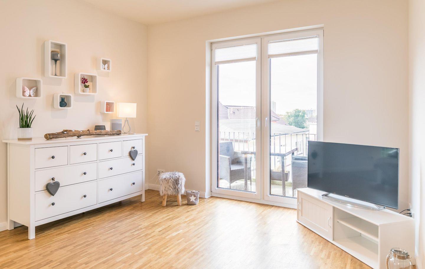 Couch, 2 Sessel, Couchtisch, Kommode, Flachbild-TV, Radio mit Bluetooth und Wifi-Verbindung, Zugang zum kleinen Balkon mit 2 Stühlen + Tisch