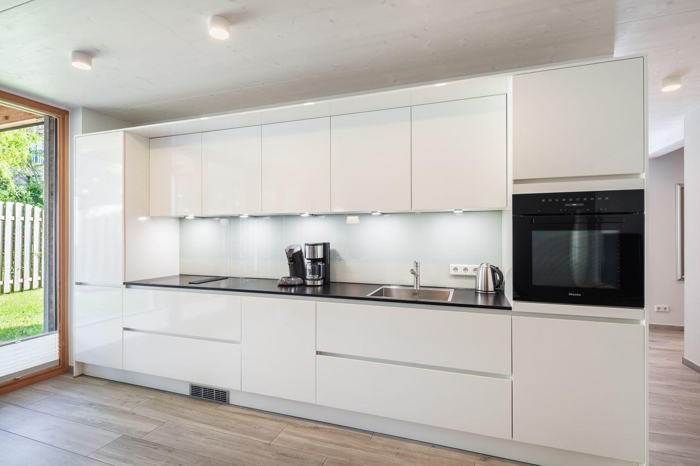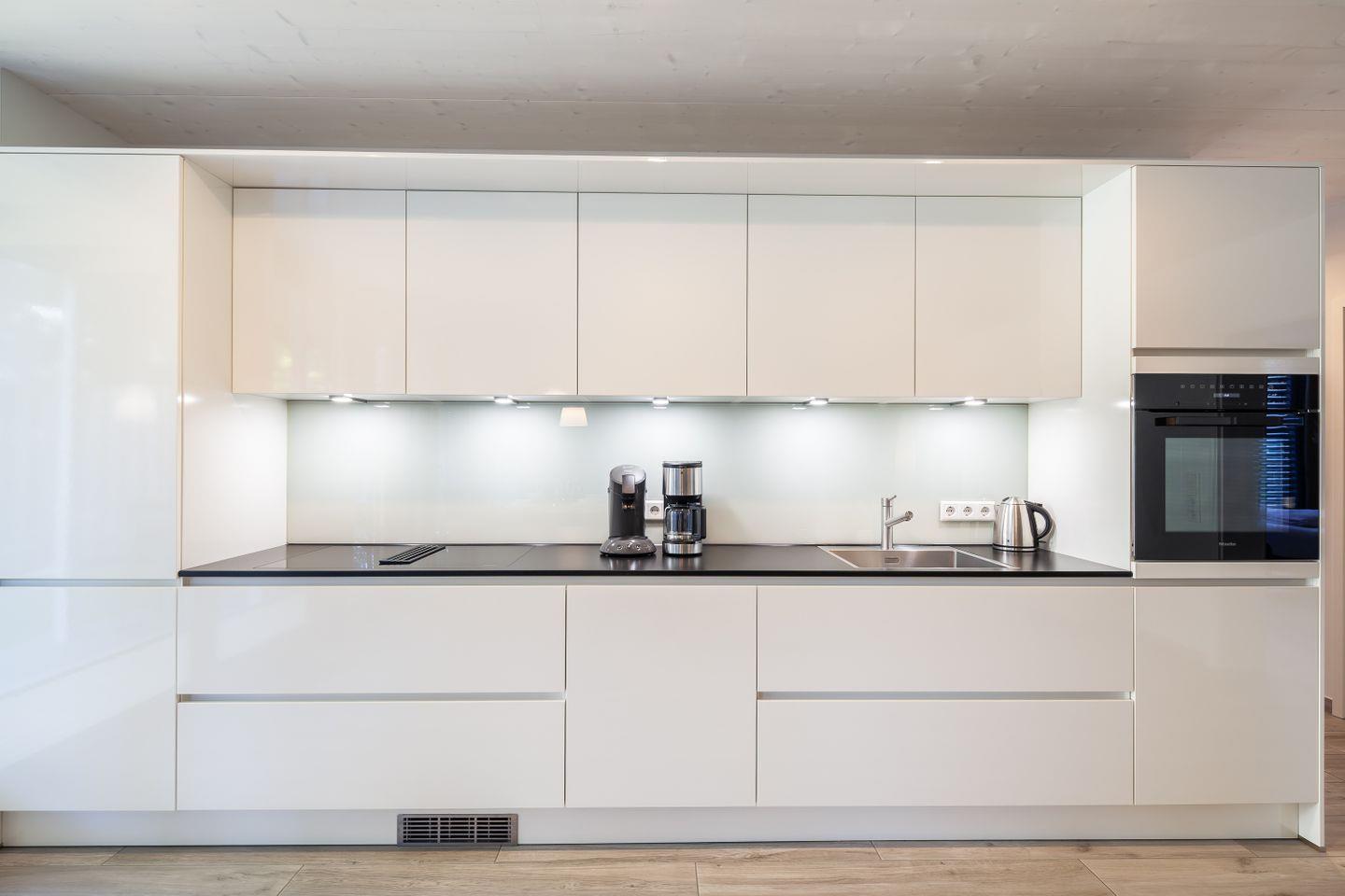 Backofen, Waschspülbecken, Geschirrspüler, Induktionsherd mit integriertem Abluftsystem, Kühlschrank mit Gefrierfach, Kaffeemaschine, Kaffeepadmaschine, Toaster, Wasserkocher,
