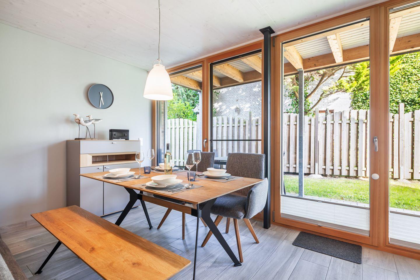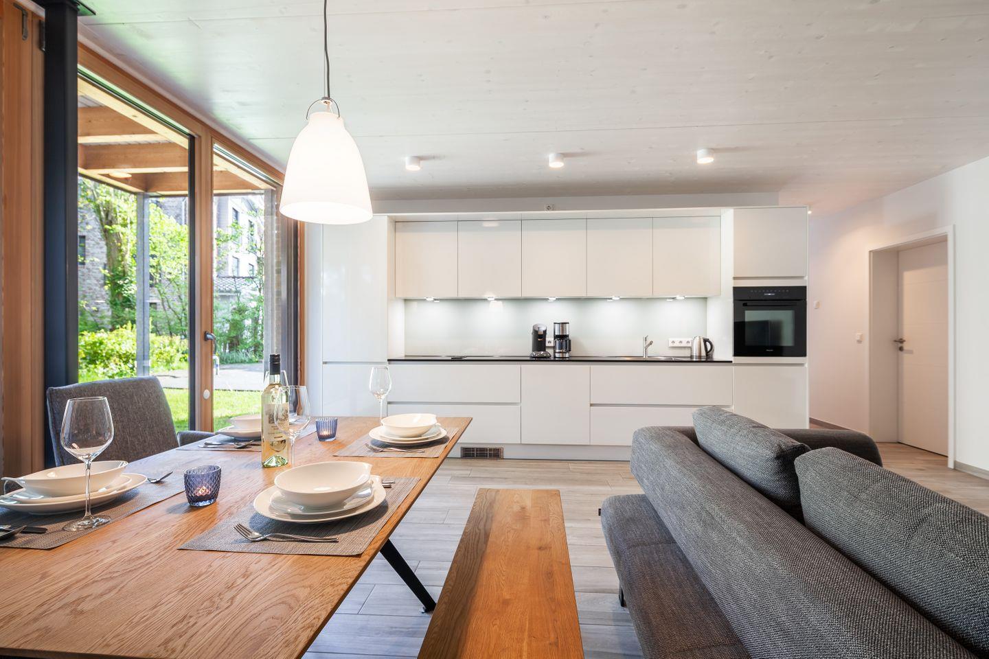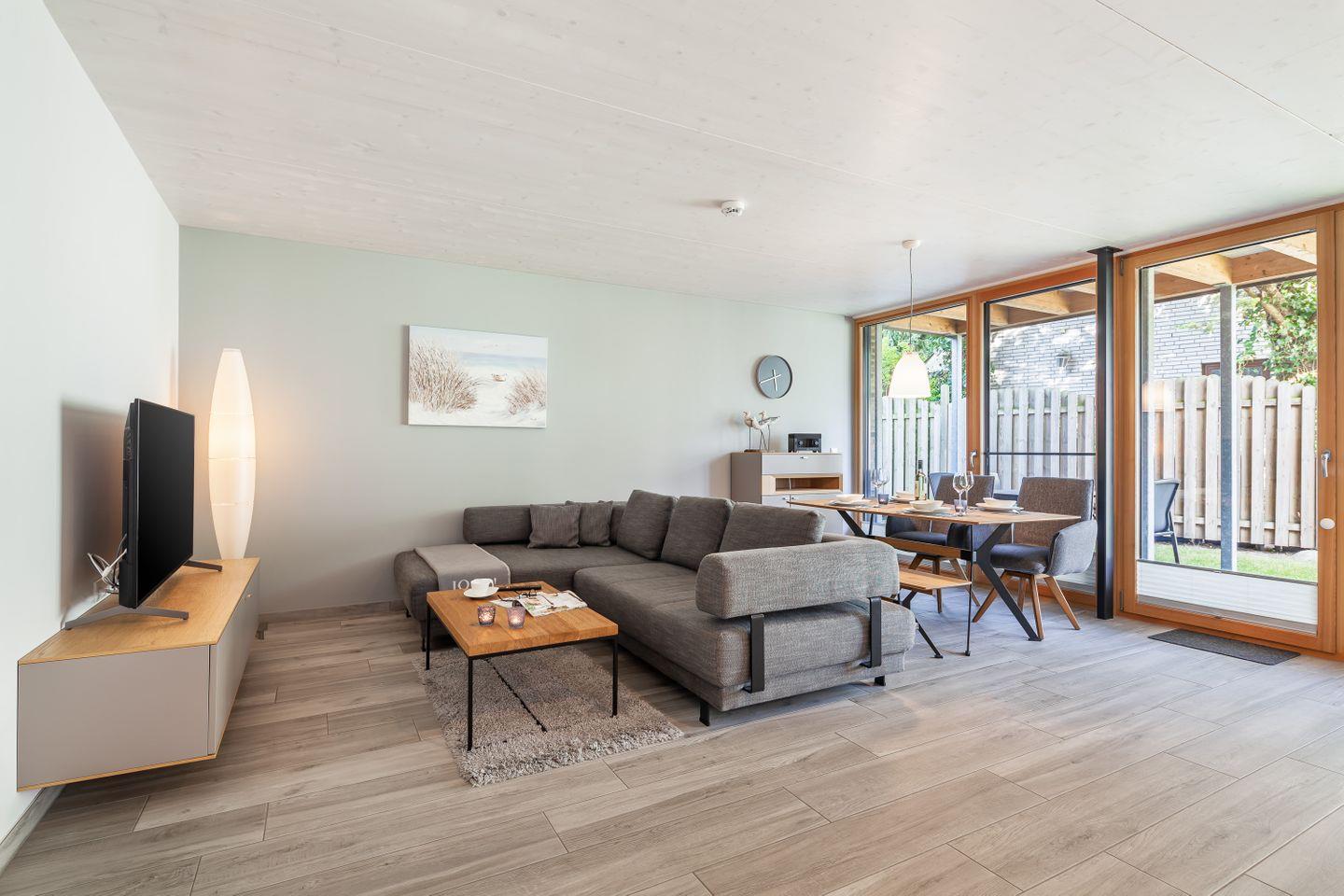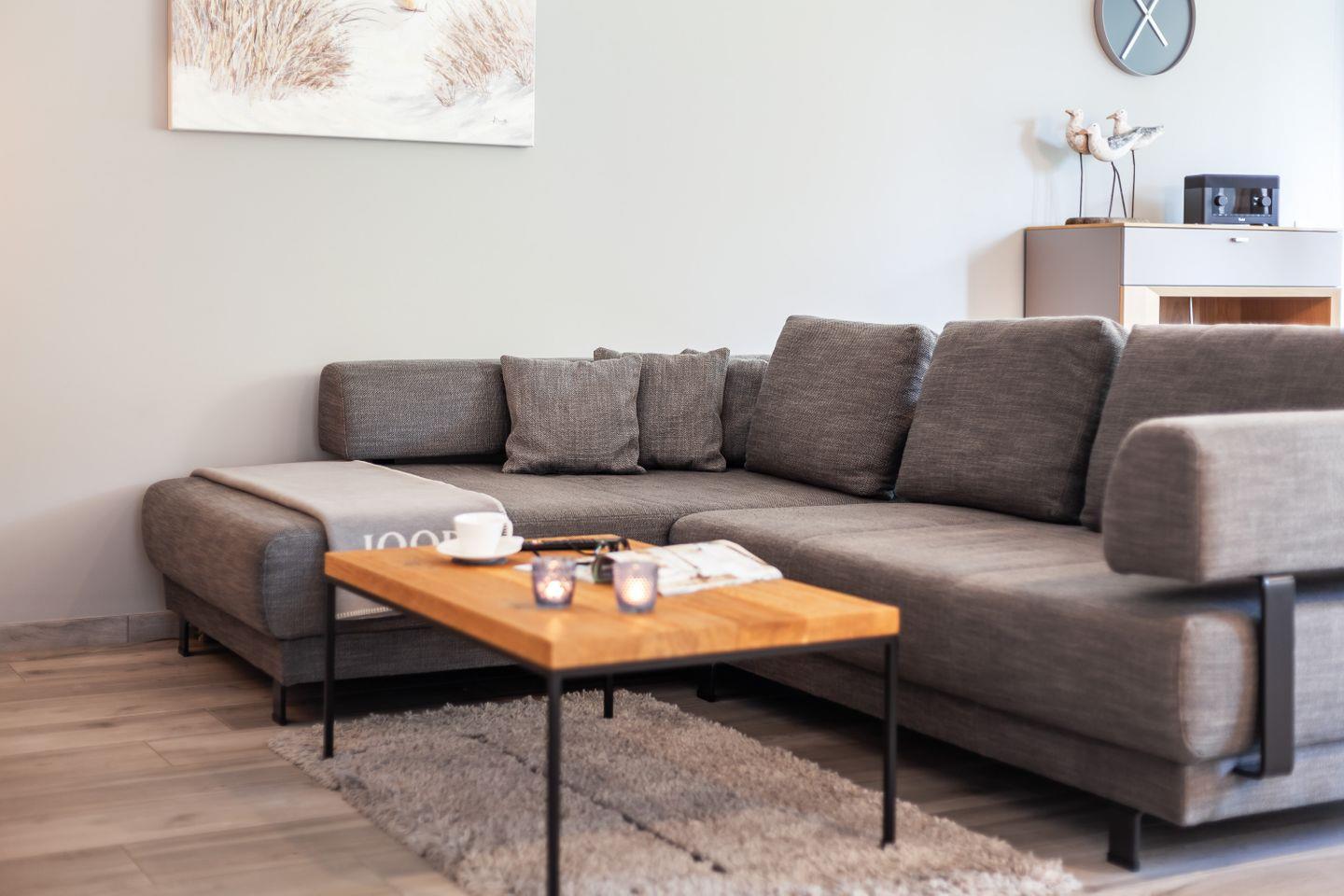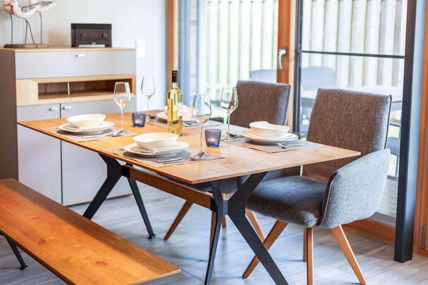 Streamingfähiger Flatscreen-TV für alle gängigen Formate (Netflix, Google Play, Prime Video u. v. m.), Couch mit Récamiere, Couchtisch, Sideboard, DAB+ Radio mit Bluetooth-Funktion, Esstisch mit zwei Stühlen und Sitzbank, Zugang zur Terrasse