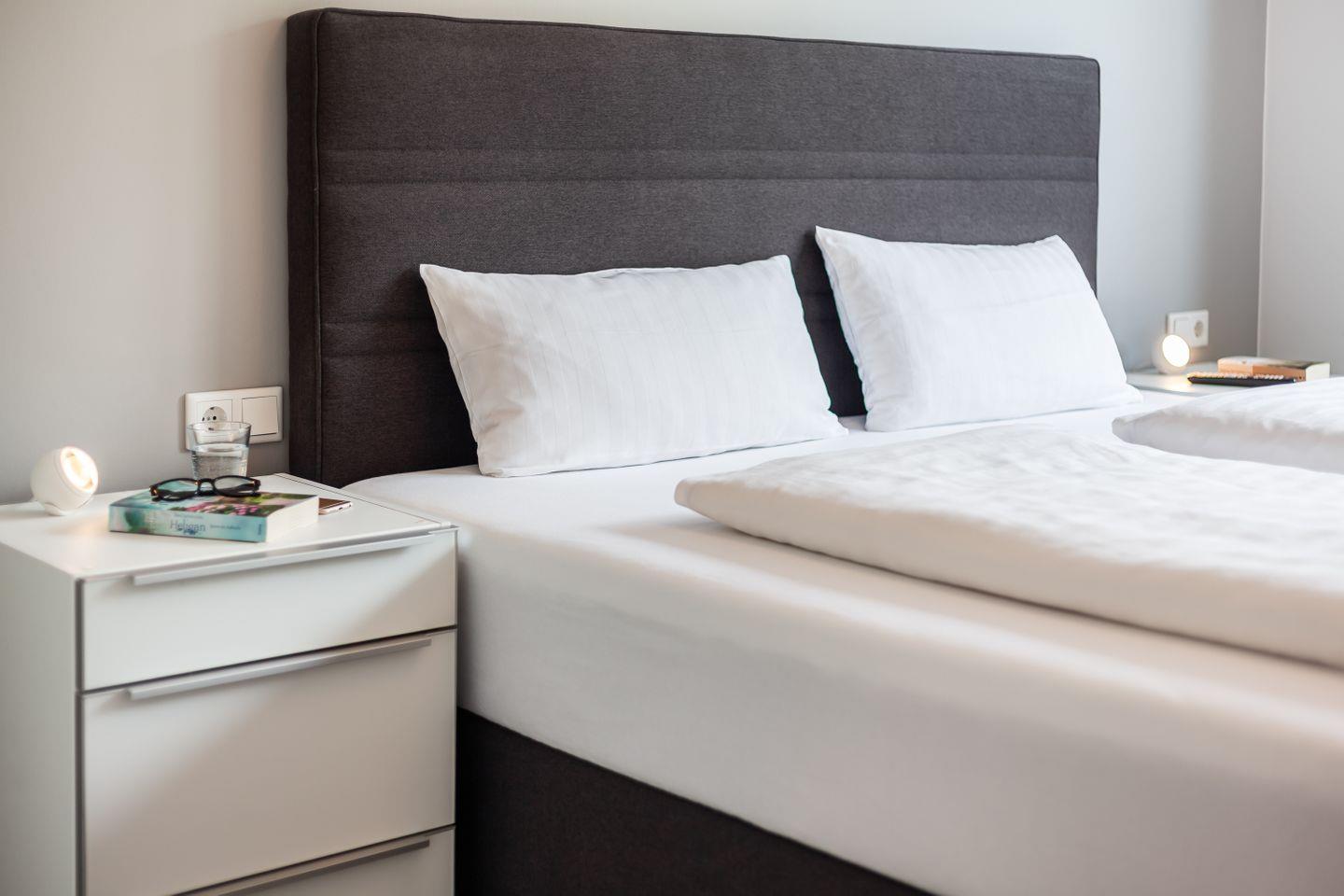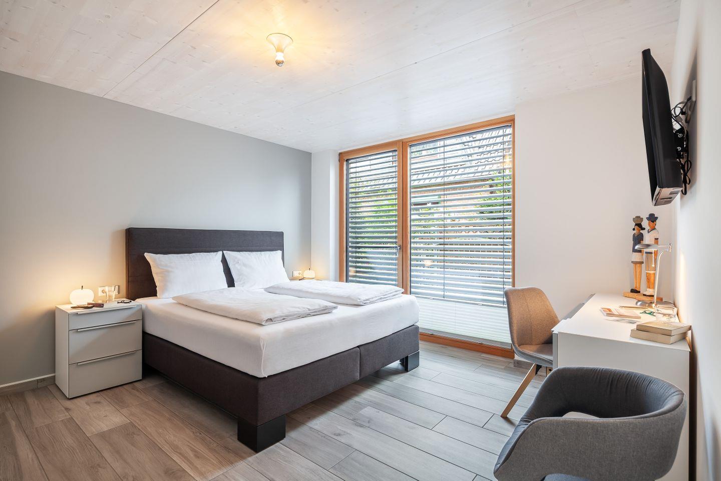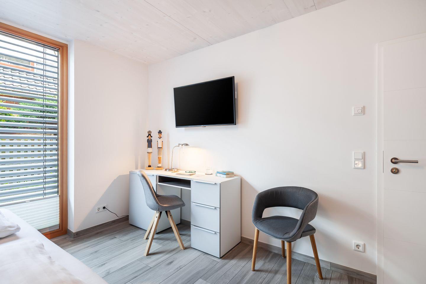 Boxspringdoppelbett mit durchgehender Topper-Matratze (1,80 x 2,00 m), Nachttische, Nachttischlampen, Kleiderschrank, streamingfähiger Flatscreen-TV für alle gängigen Formate (Netflix, Google Play, Prime Video u. v. m.), Schreibtisch mit Stuhl, elektrische Außenrollläden, Plissees, Insektenschutz
