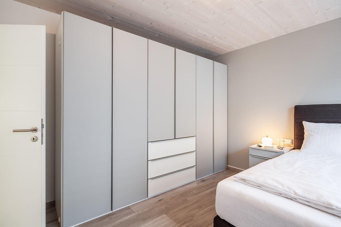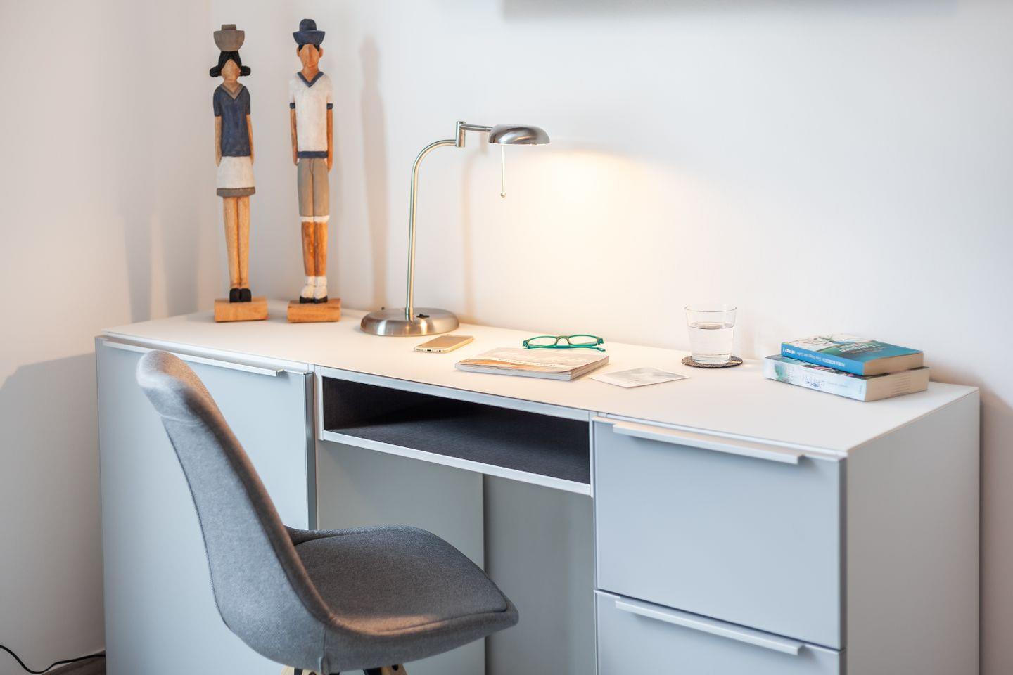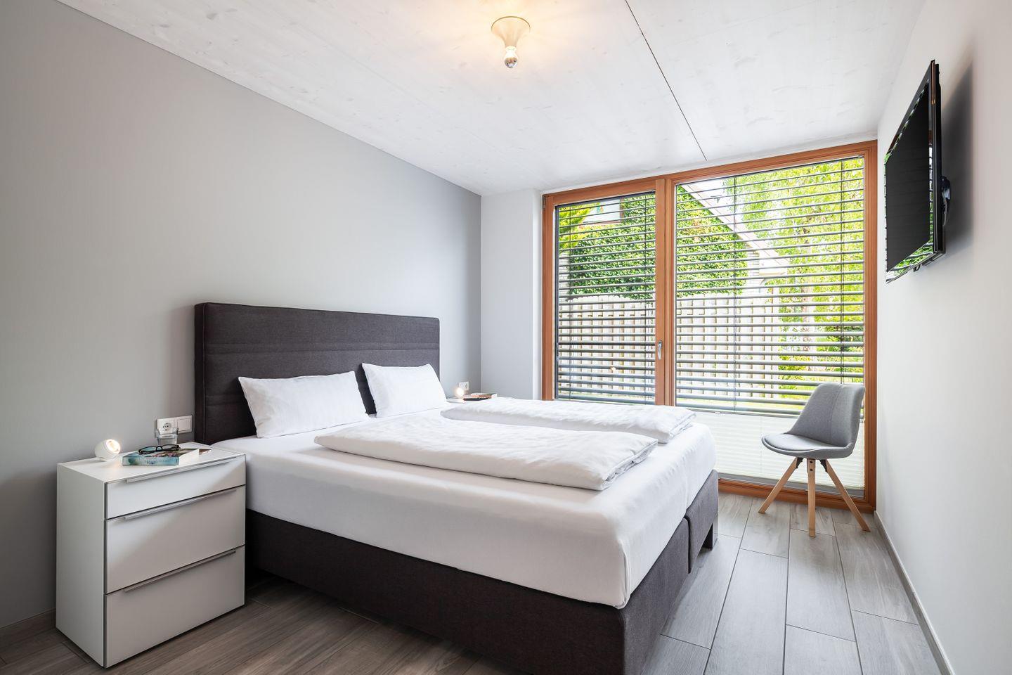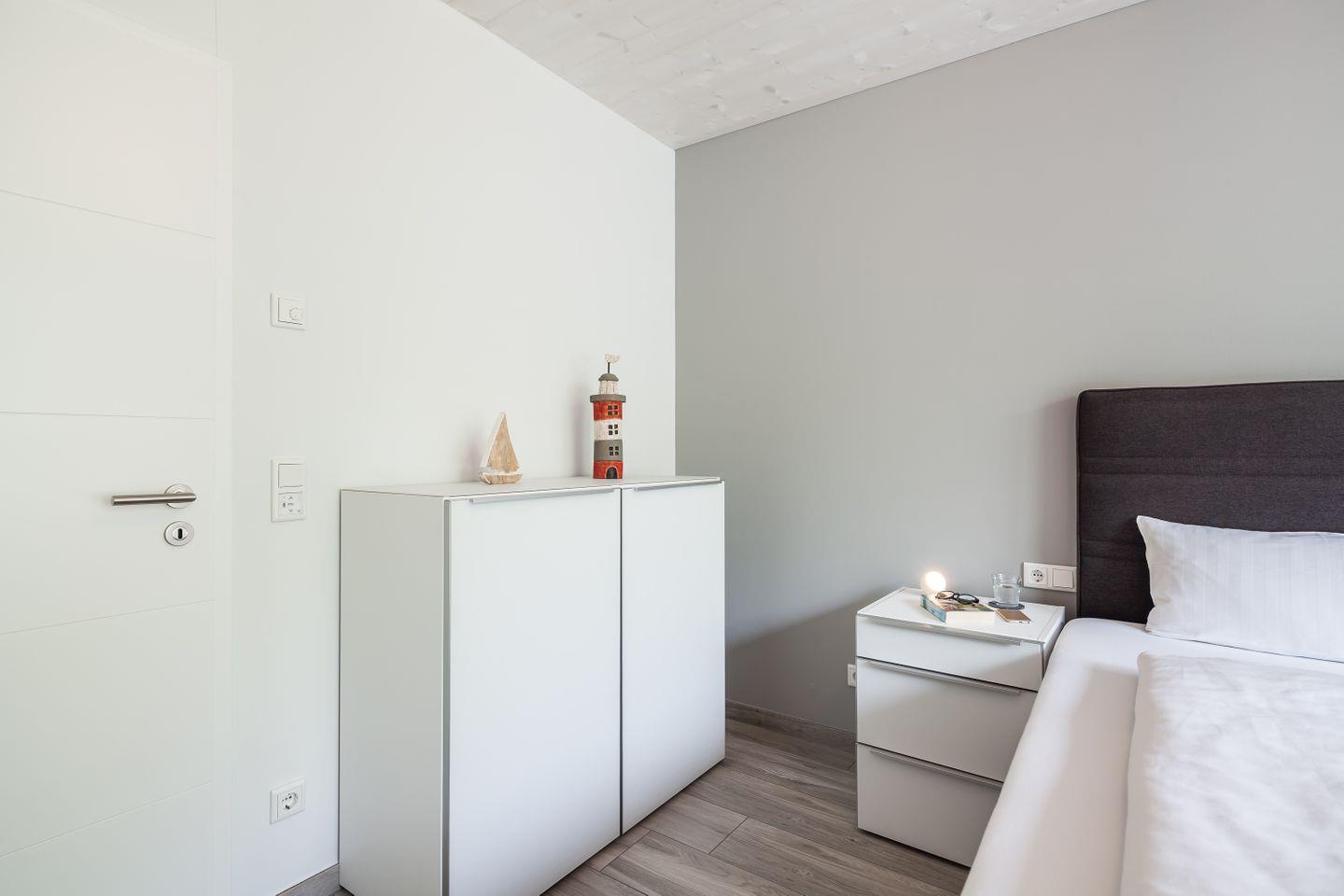 Von hier aus erreichen Sie die möblierte Terrasse sowie das Hauptschlafzimmer, das mit einem großen Kleiderschrank, einem kleinen Schreibtisch und einem wandhängenden Flatscreen-TV ausgestattet ist. Auch das zweite Schlafzimmer ist gemütlich eingerichtet. Es ist ebenfalls mit einem Flatscreen-TV ausgestattet. In den großen Boxspringdoppelbetten werden Sie einen himmlischen Schlaf erleben.