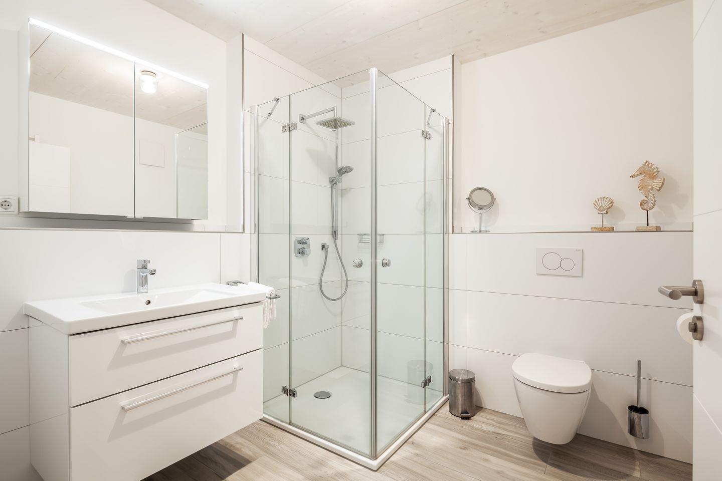 Dusche, Waschbecken mit Unterschrank und beleuchtetem Spiegelschrank, WC, Handtuchheizkörper, Föhn, Kosmetikspiegel, Abluft, Radio, Duschhocker
