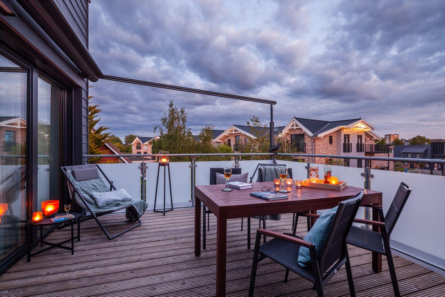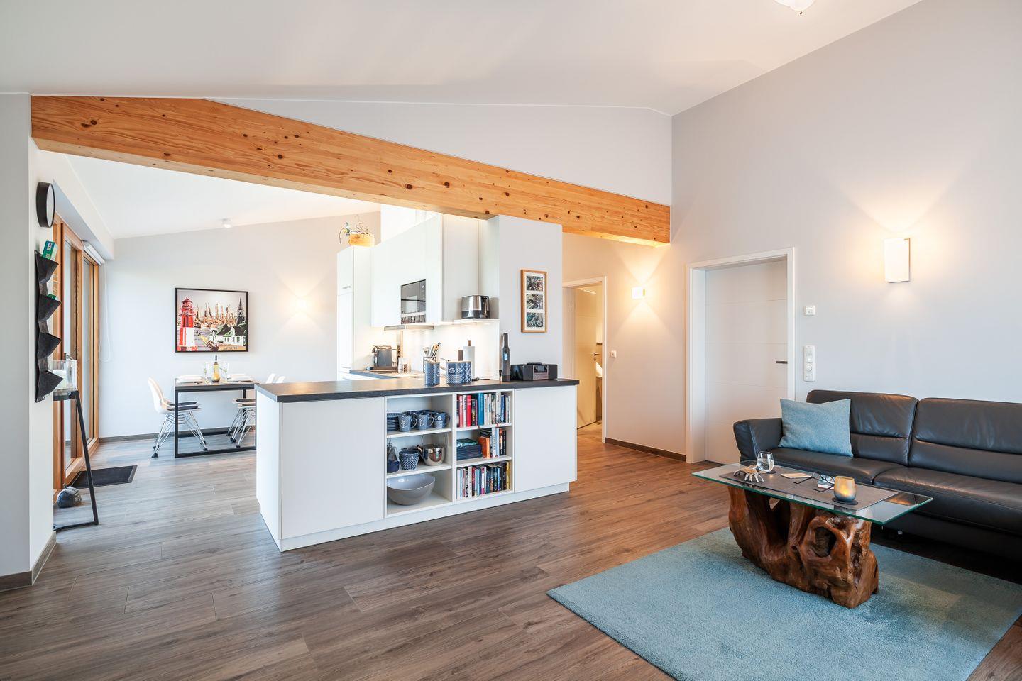 Der offen gestaltete Wohn- und Essbereich ist lichtdurchflutet und geht nahtlos in den Balkon über. Das eigentliche Highlight ist jedoch die großzügige Dachterrasse: Ihr persönlicher Lieblingsplatz unter freiem Himmel – ob beim ersten Kaffee am Morgen oder beim Ausklang eines Urlaubstages an der frischen Nordseeluft.