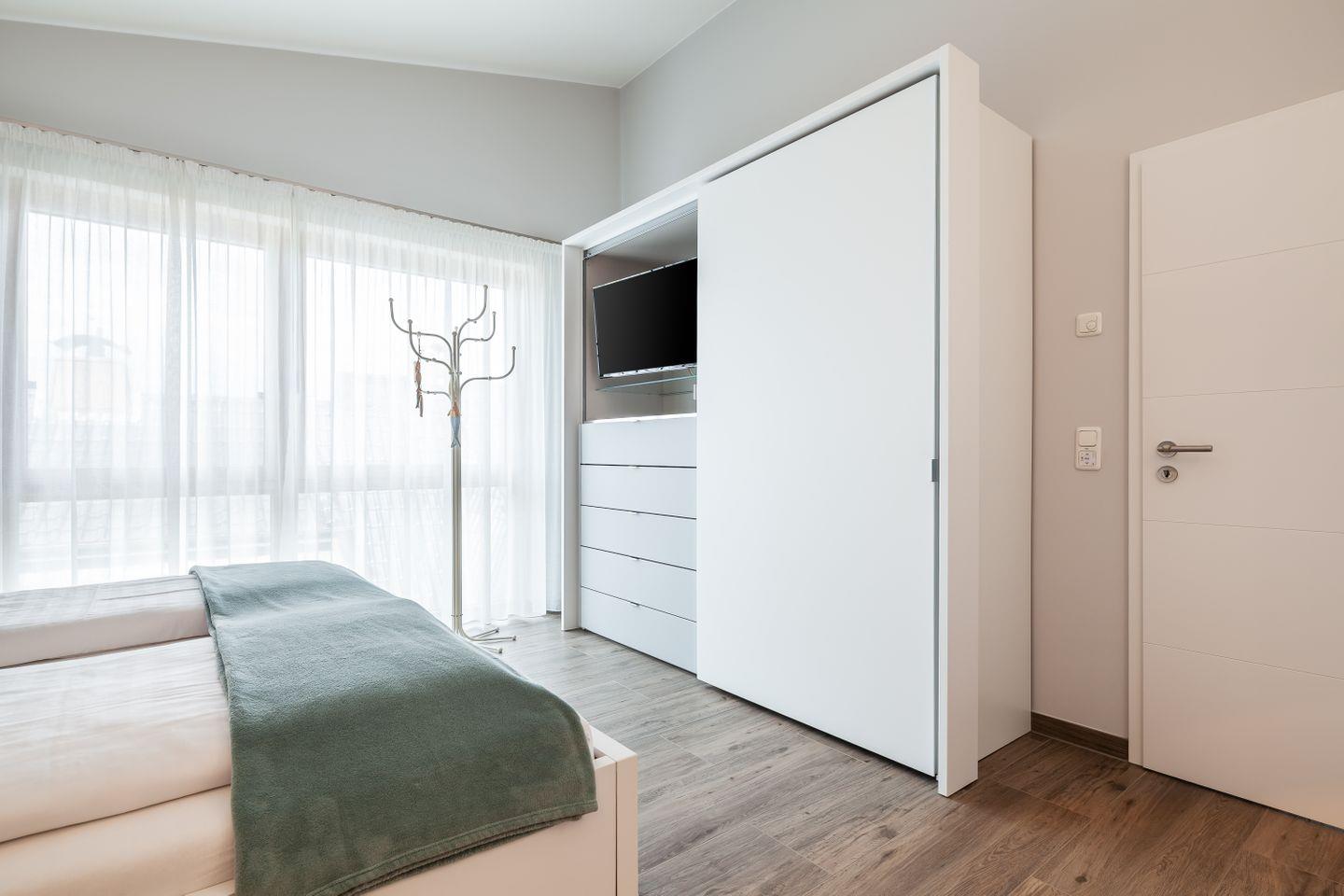 Doppelbett (2 Matratzen 0,90 x 2,00m), Nachttische + Lampen, beleuchteter großer Kleiderschrank mit eingebautem Flachbild-Smart-TV, elektrische Verdunkelungsrollos, Insektenschutz, Schreibtisch mit Home Office - Arbeitsplatz Zugang zur Dachterrasse