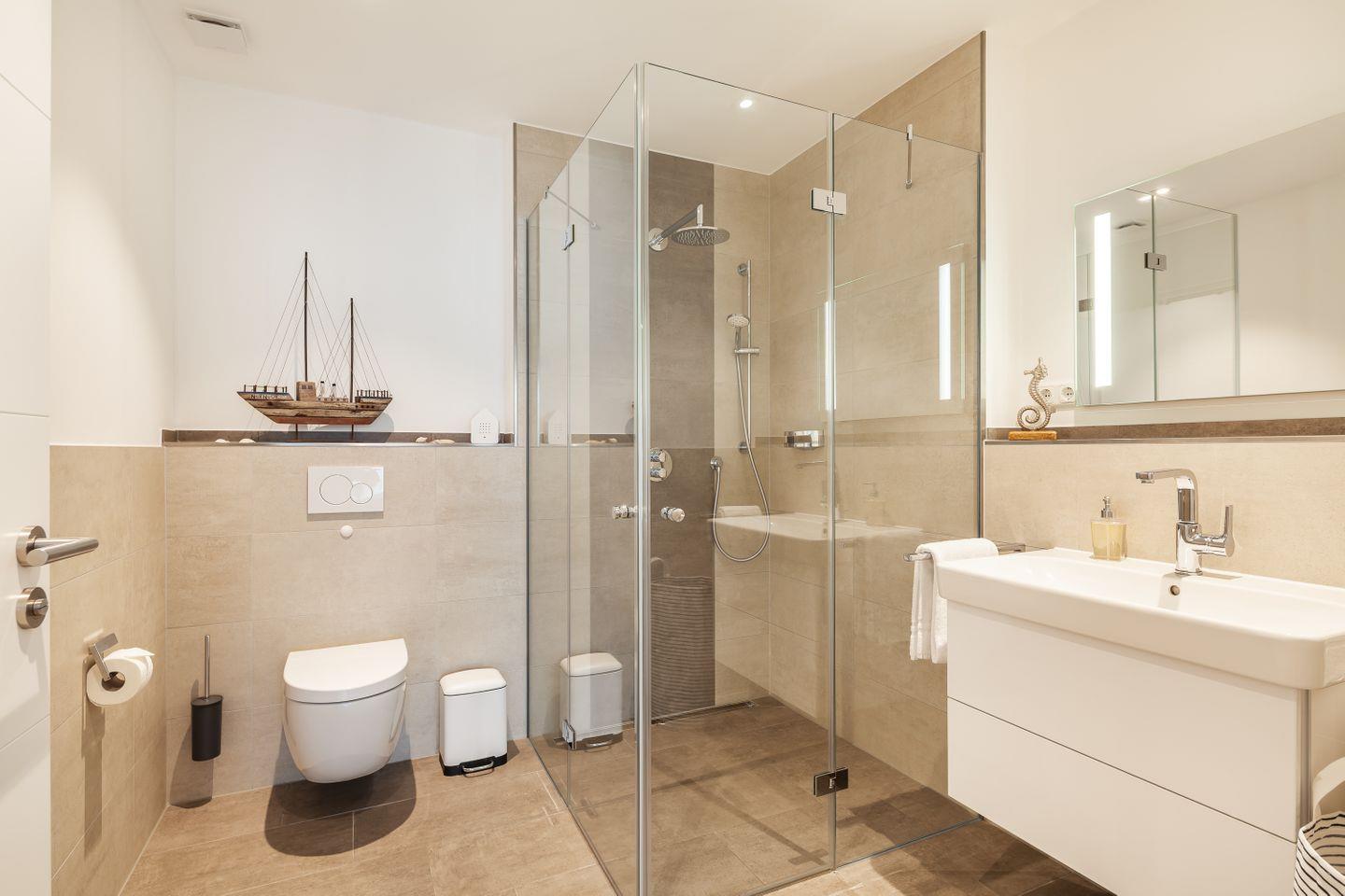 bodentiefe Dusche, WC, beleuchteter Spiegel, Waschbecken mit Unterbauschrank, Handtuchtrockner, Föhn, Abluft