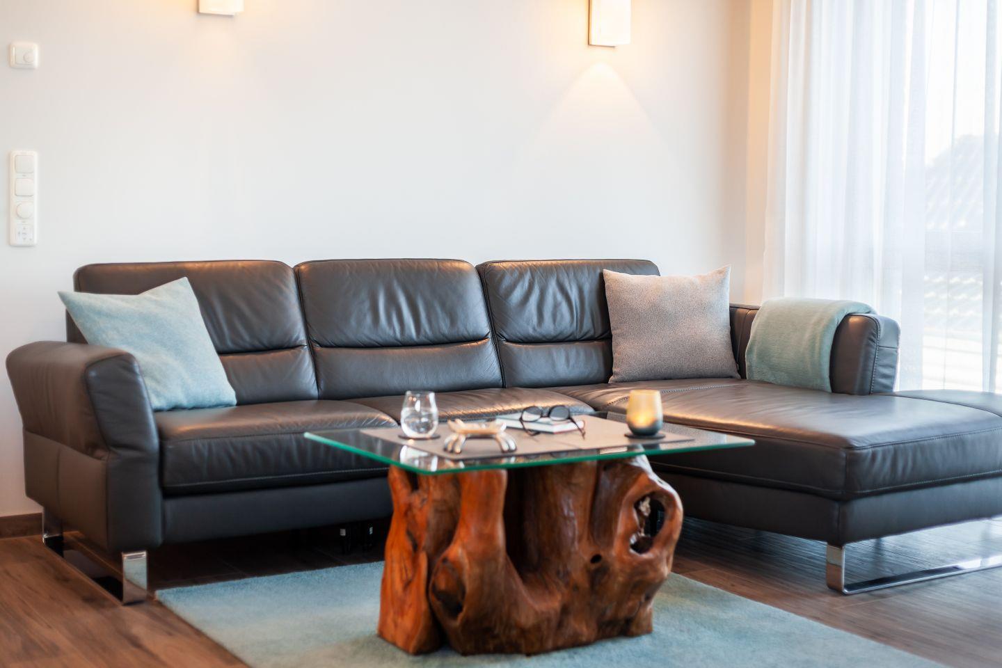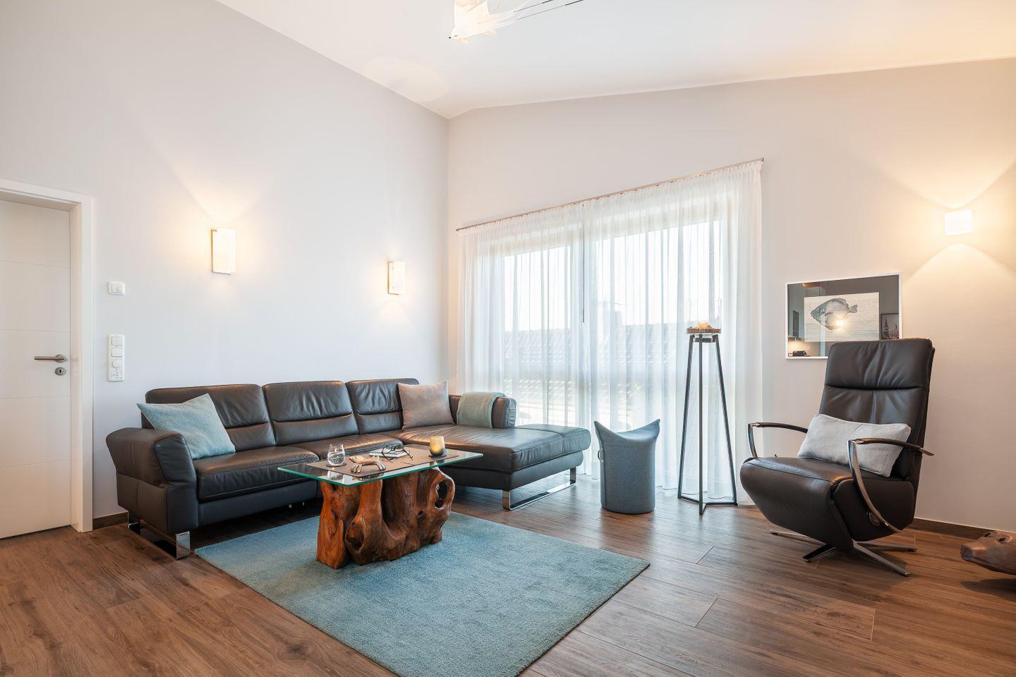 Ledercouch, Relaxsessel, Couchtisch, Flachbild-Smart-TV, DAB+Radio mit Bluetooth und CD-Spieler, Esstisch + Stühle, Zugang zum möblierten Balkon, Insektenschutz