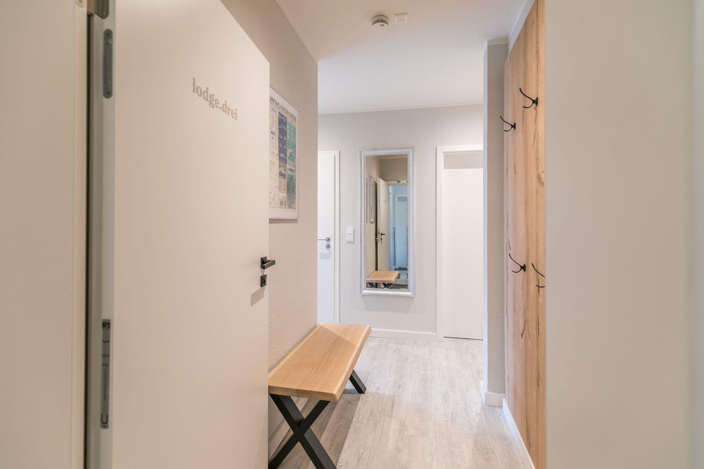 Die Lodge 3 befindet sich im 1. Obergeschoss und hat einen eigenen Balkon samt Gartenmöbeln. Ruhige und dennoch nahezu zentrale Lage.