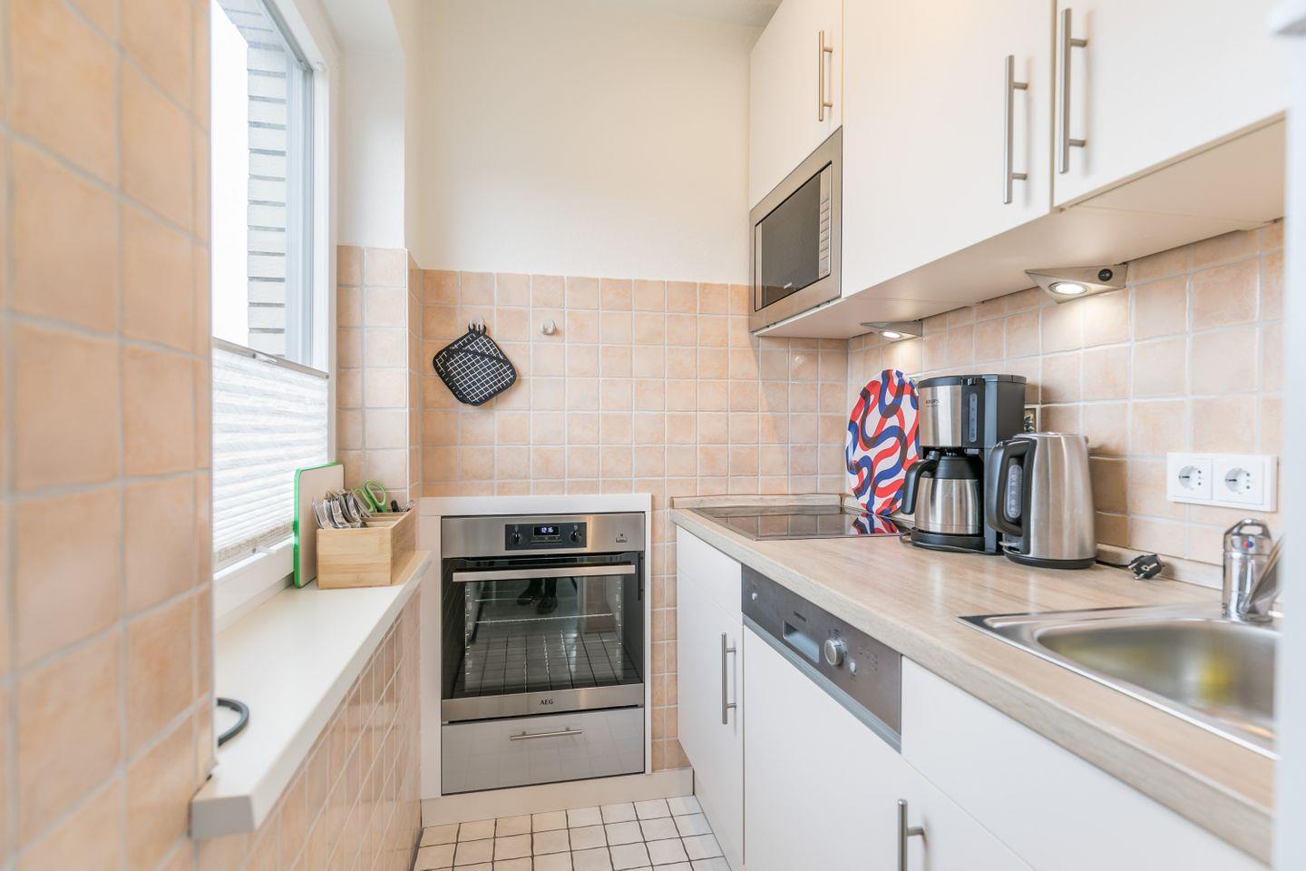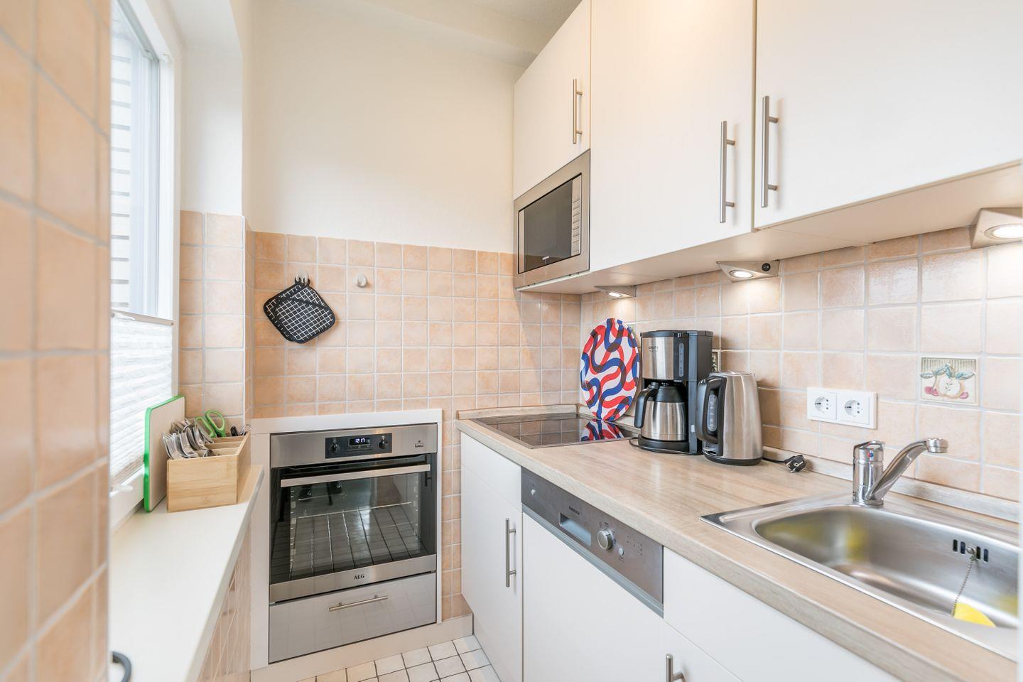 Backofen, Ceranfeld, Geschirrspüler, Kühlschrank mit Eisfach, Kaffeemaschine, Wasserkocher, Toaster, Eierkocher, Dunstabzugshaube, Mikrowelle, Esstisch mit 4 Stühlen