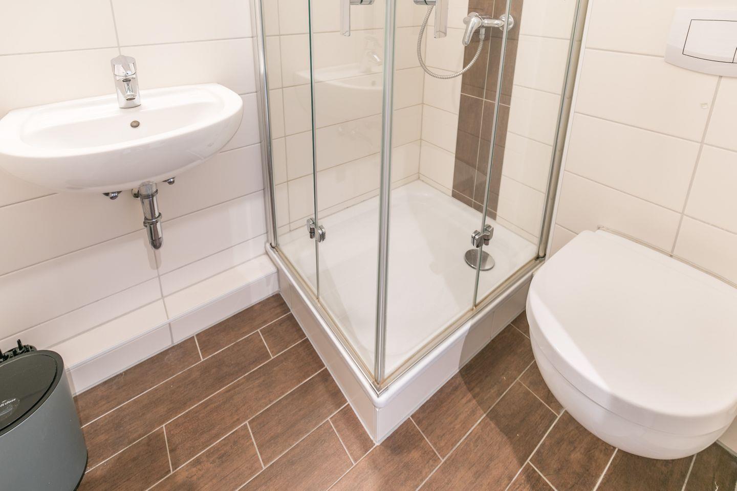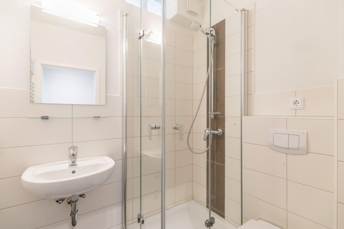 Dusche, WC, Waschbecken, Spiegel mit Ablage, Handtuchtrockner, Föhn, Abluft