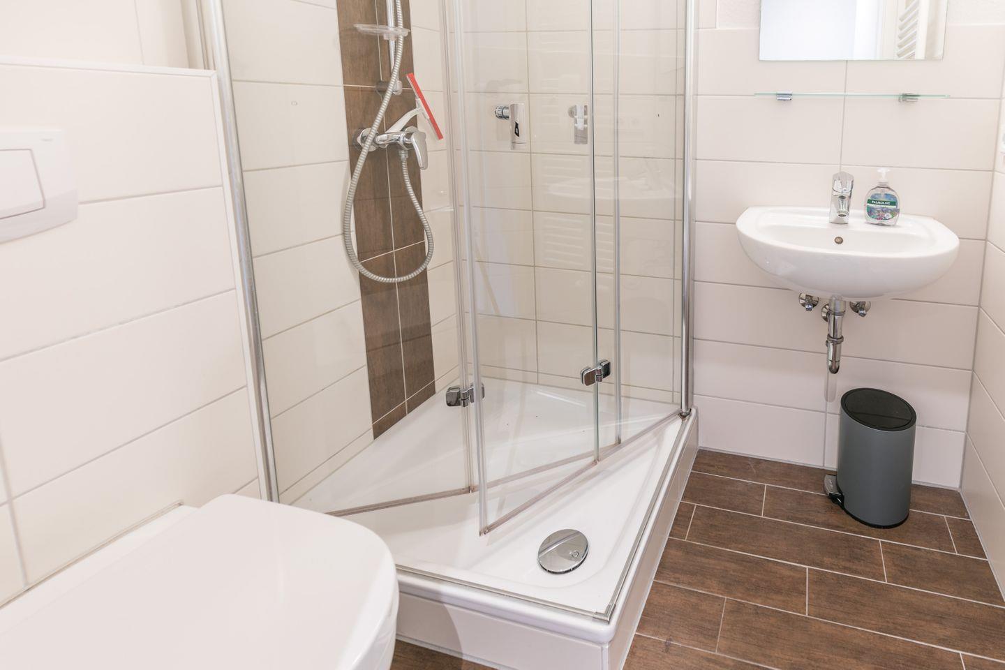 Dusche, WC, Waschbecken, Spiegel mit Ablage, Handtuchtrockner, Föhn, Abluft