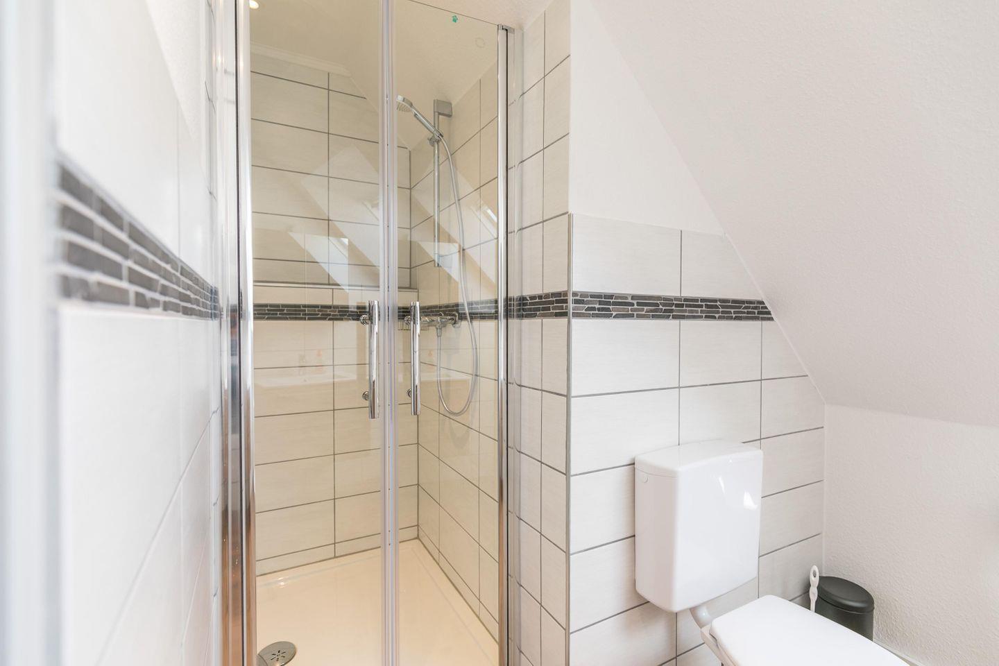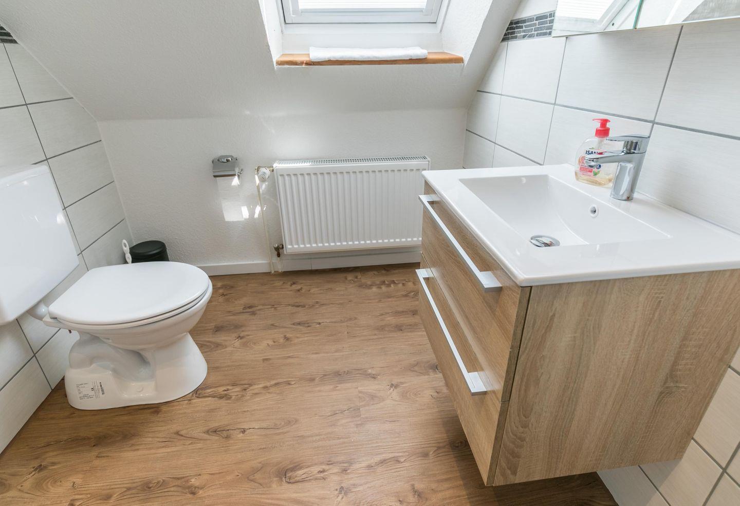 Dusche, WC, Waschbecken mit Schränkchen, Fenster