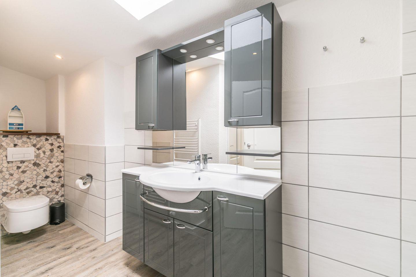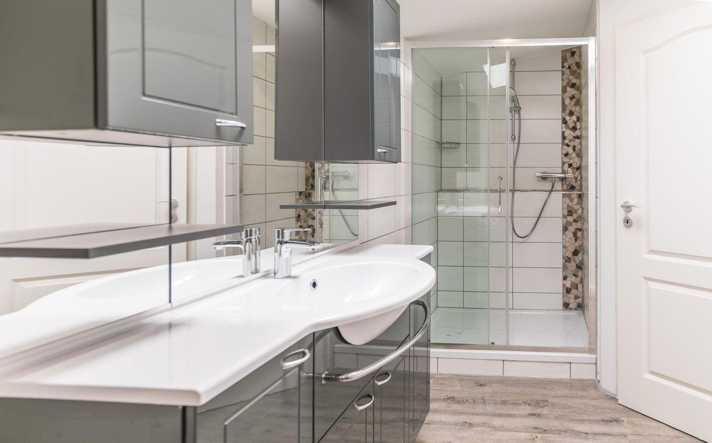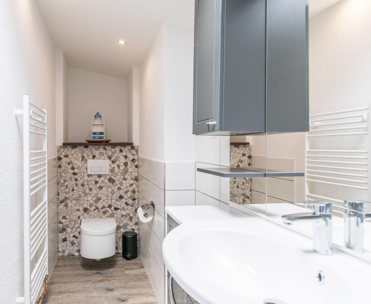 Dusche, WC, Waschbecken, Spiegelschrank, Handtuchtrockner