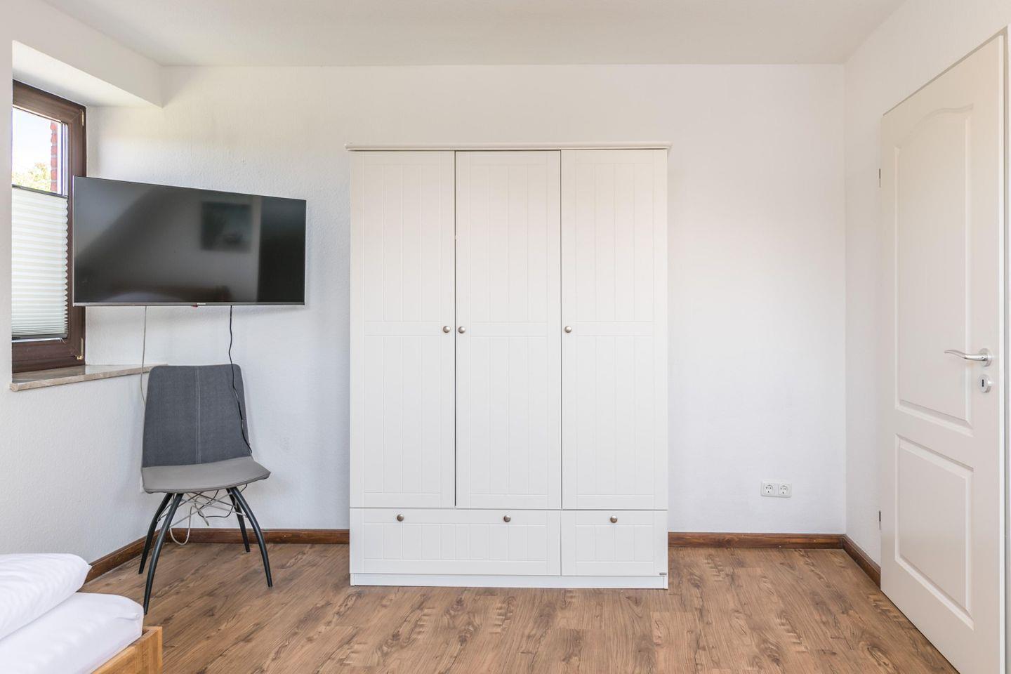 Zwei Einzelbetten, (0,90x2,00m), Nachttische + Lampen, Kleiderschrank, Flachbild-TV, Fliegengitter