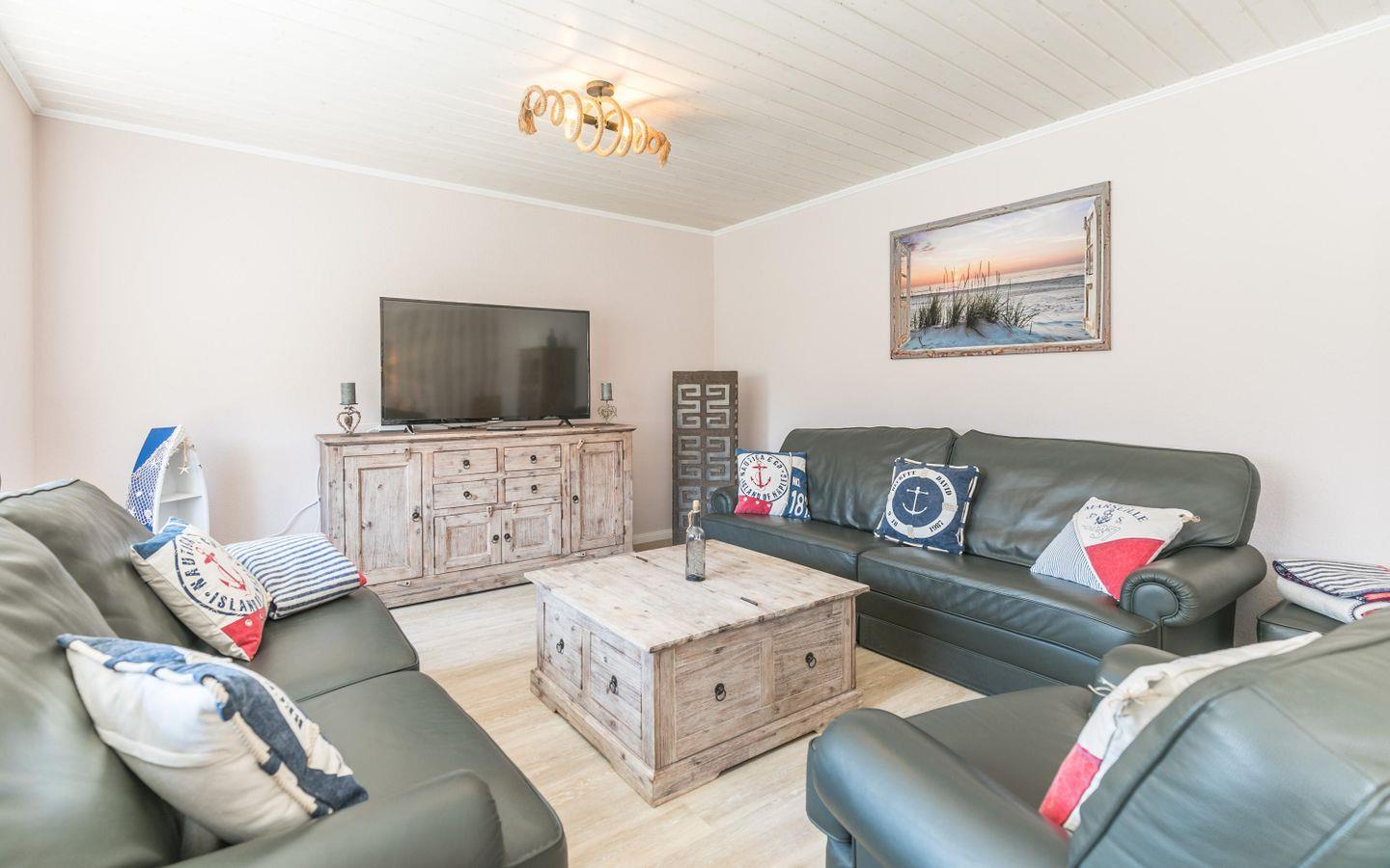 Im großen Wohnraum können Sie die aufregenden Tage ganz entspannt in den gemütlichen Ledersofas ausklingen lassen. Im Obergeschoss befinden sich die drei Schlafräume, jeweils ausgestattet mit einem großen Kleiderschrank und Flachbild-TV. Zwei Bäder sorgen dafür, dass morgens kein Stau vor der Dusche entsteht...