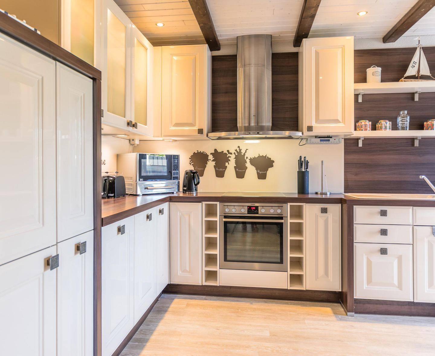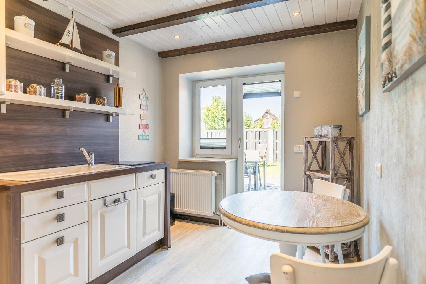 Induktionsherd, Backofen, Geschirrspüler, Spüle, Kühlschrank Gefrierschrank, Wasserkocher, Toaster, Kaffeemaschine, Kaffee-Pad-Maschine, Tisch mit 2 Stühlen, Zugang zum Garten